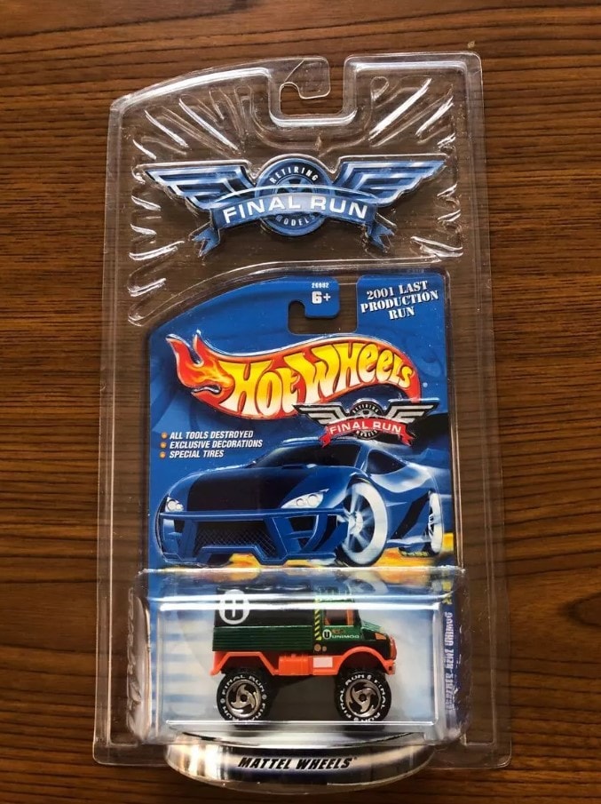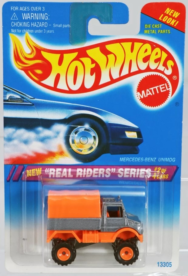 But go back to the '90s, and you'll discover another piece of diecast history signed by Larry Wood. Notice the removable top: a neat feature for a Mainline series collectible. By 1995, the Unimog joined the Real Riders series, making it all the more desirable despite the orange/gray color combo.