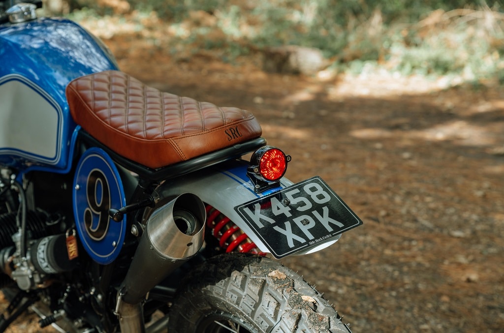 It features brown leather upholstery and elegant diamond pattern stitching, as well as some SRC lettering embroidered at the back. The seat is flanked by a pair of oval side covers which act as number boards, and a sizeable handmade fender lives right beneath it. This rear mudguard carries the license plate holder and a circular LED taillight.