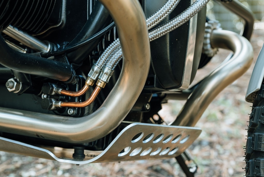 Not only was the air-cooled mill refreshed, but it also gained several upgrades such as forged high-compression pistons, a modern electronic ignition, and a heavy-duty clutch. New Mikuni carbs were thrown into the mix, too, together with foam Ramair pod filters that replace the standard airbox. The cylinder blocks are now kept out of harm’s way thanks to protective crash bars.
