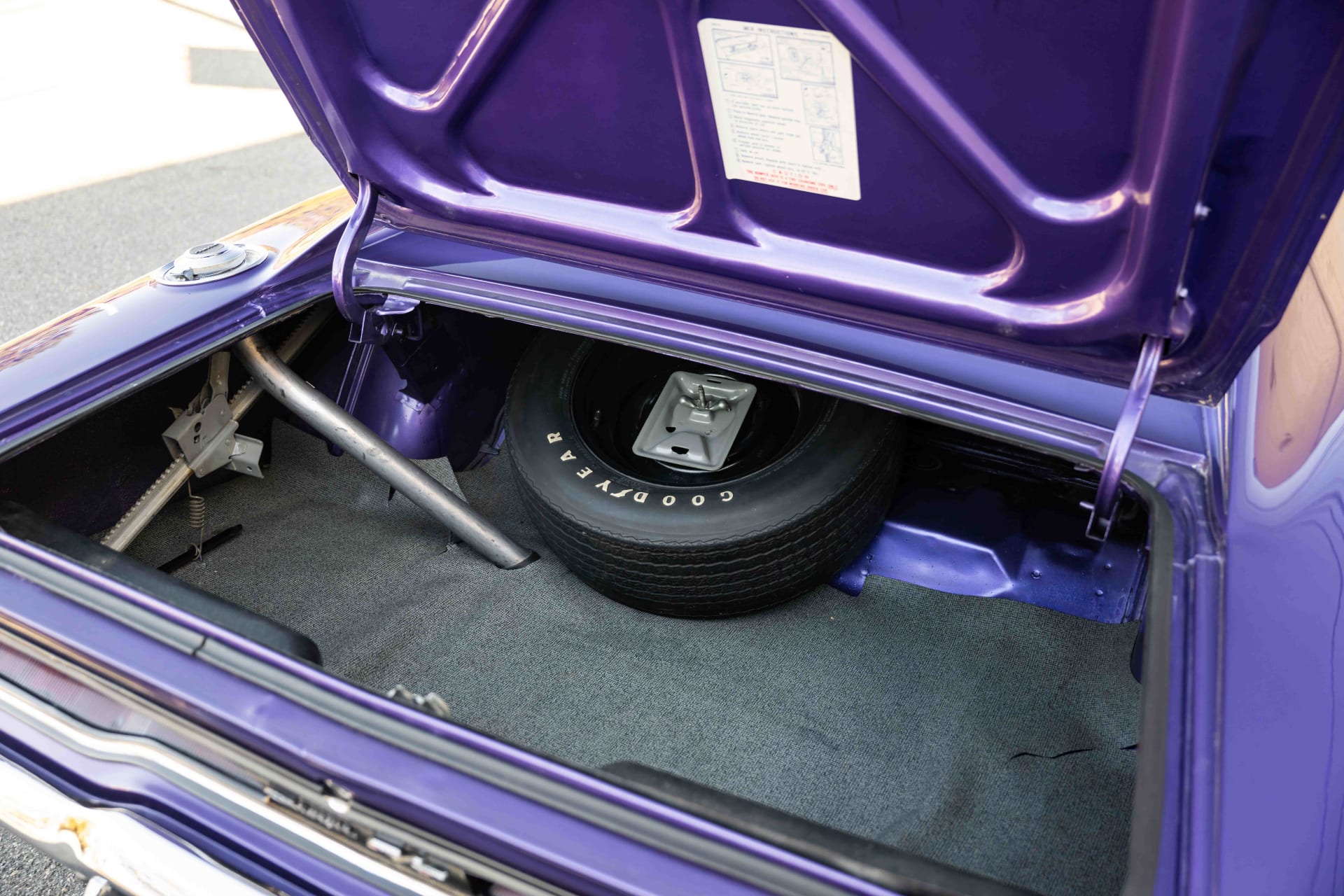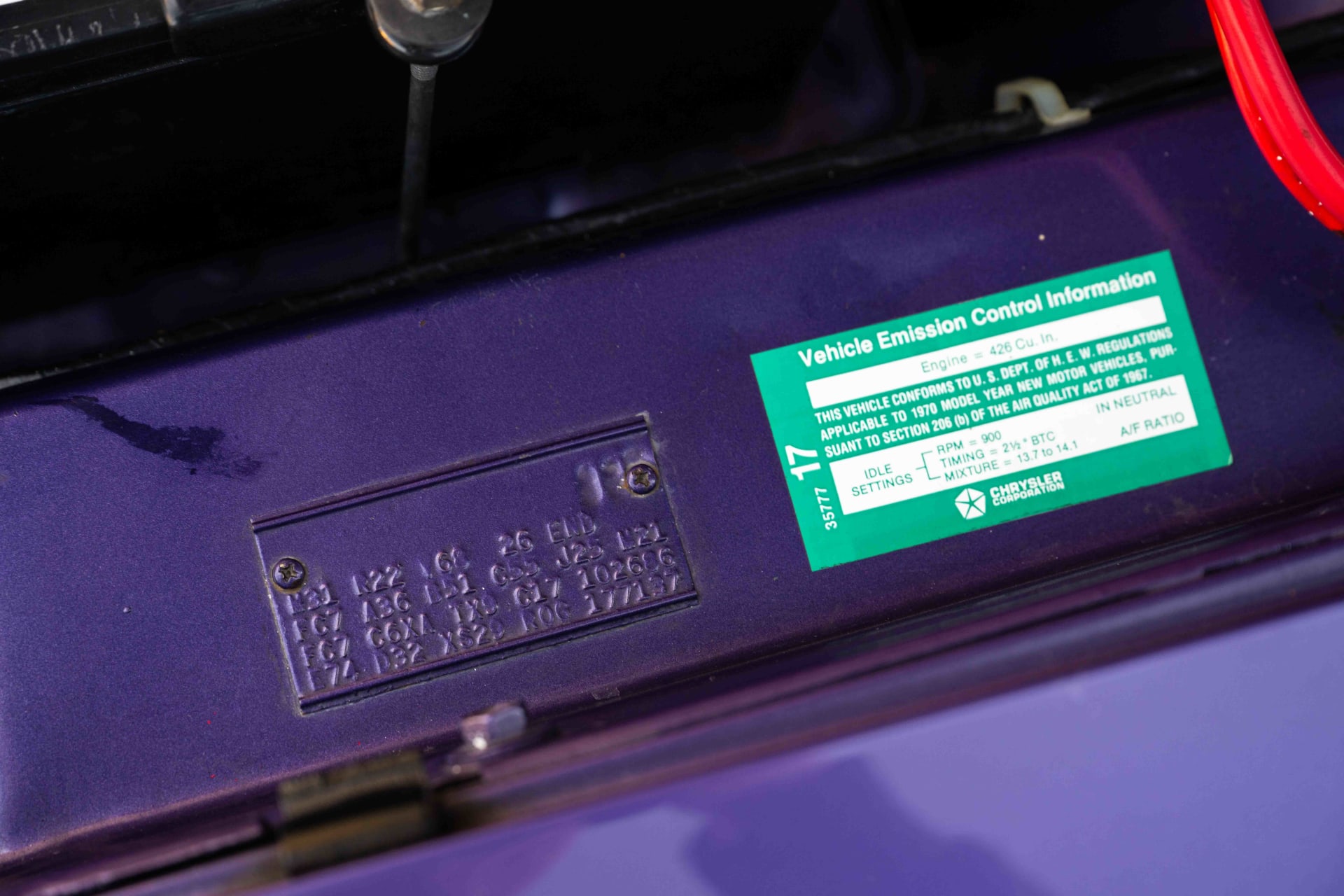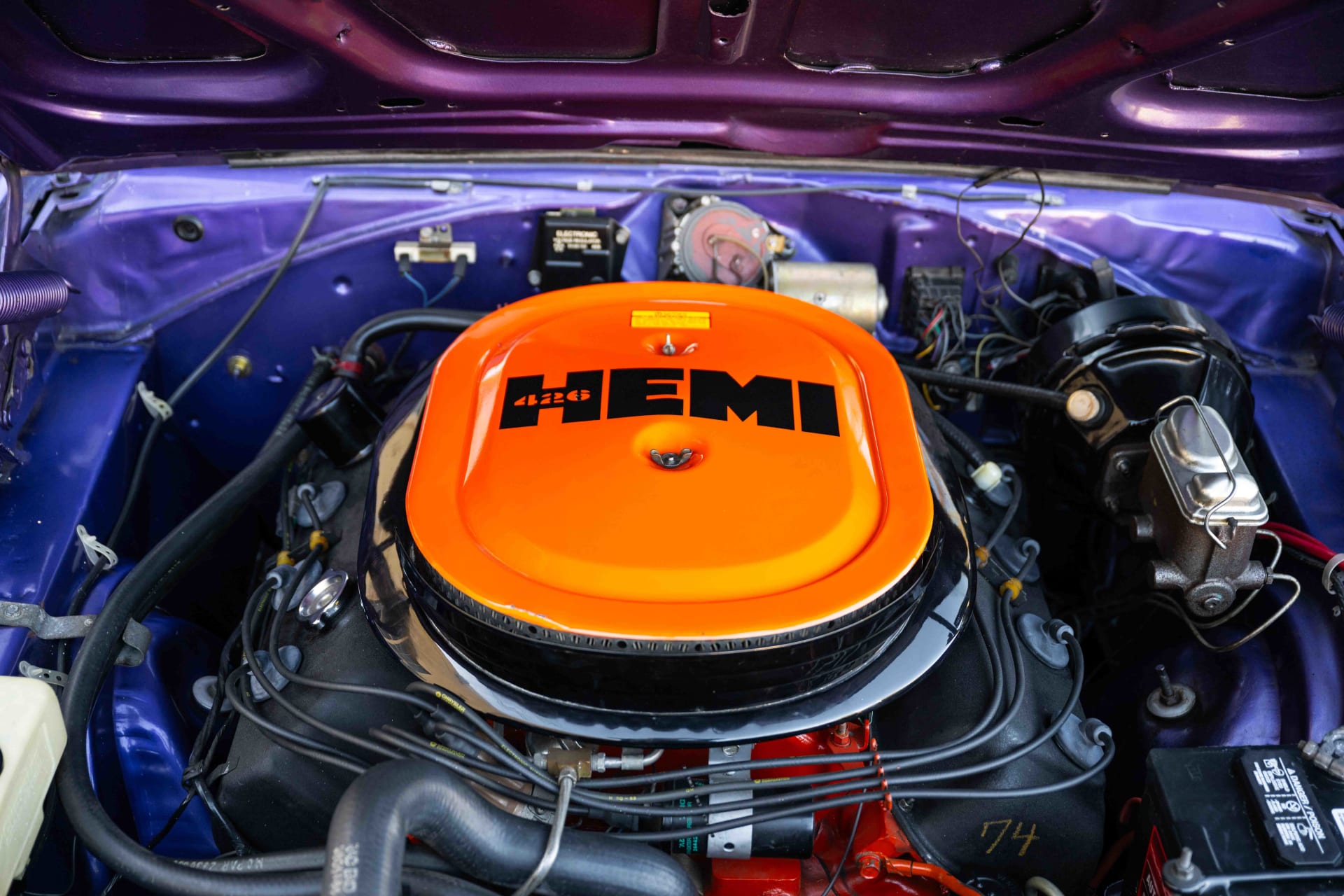 Finished in one of the coolest colors from the High-Impact color palette, Plum Crazy, this Charger packs a numbers-matching Hemi V8 engine. The mill mates to a three-speed TorqueFlite automatic, which narrows production to only 56 units. This number is actually lower if we also factor in the rear end, but the ad doesn't say whether it's a 3.55-ratio unit or a 4.10-ratio unit. Dodge built 19 with the former and 28 with the latter.