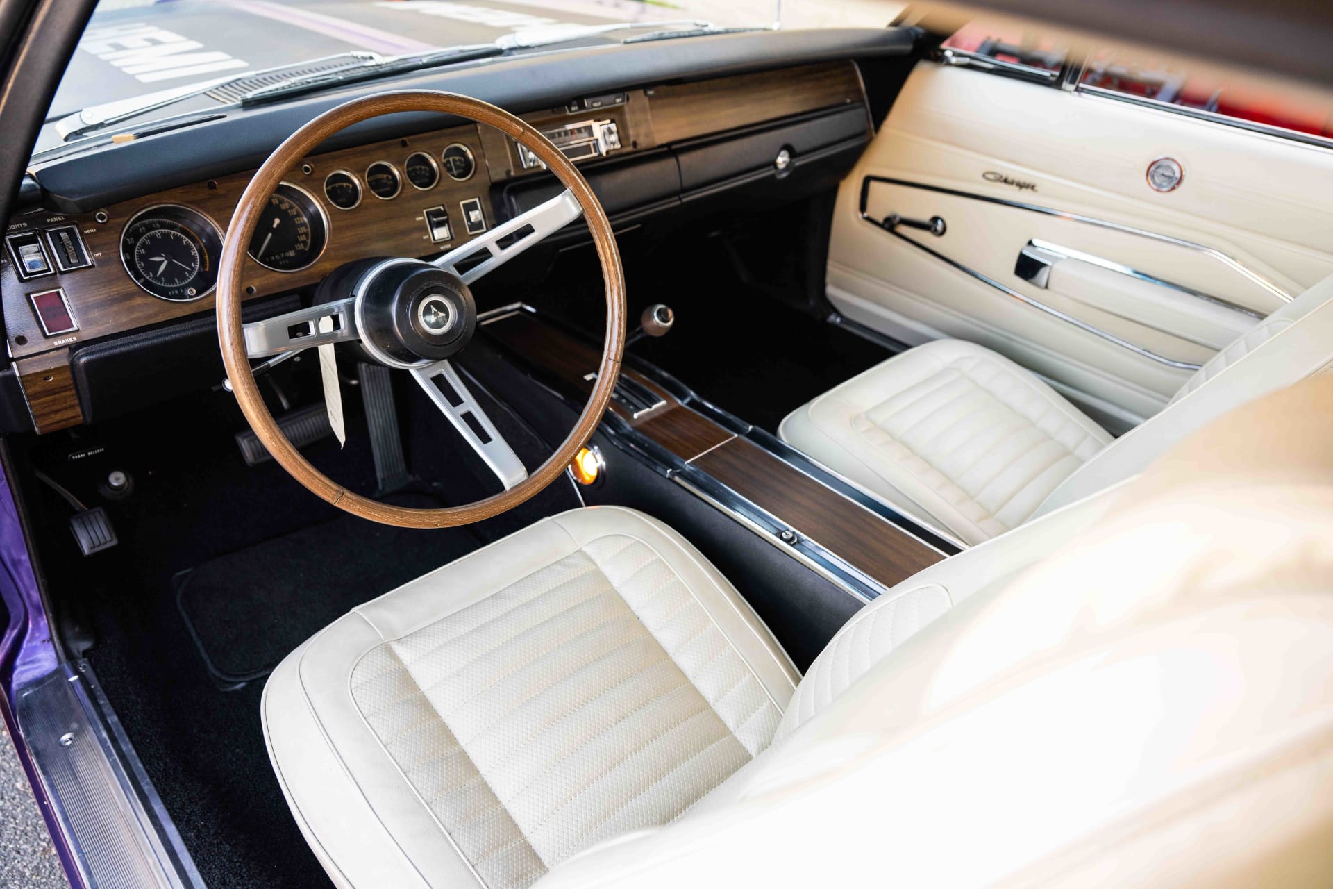 Scarcity aside, this Charger is so clean you can eat off it. The Plum Crazy paint is deep and shiny, and the white interior is flawless (which is a big deal, given how difficult it is to maintain this shade). Whoever restored this Mopar did a tremendous job.