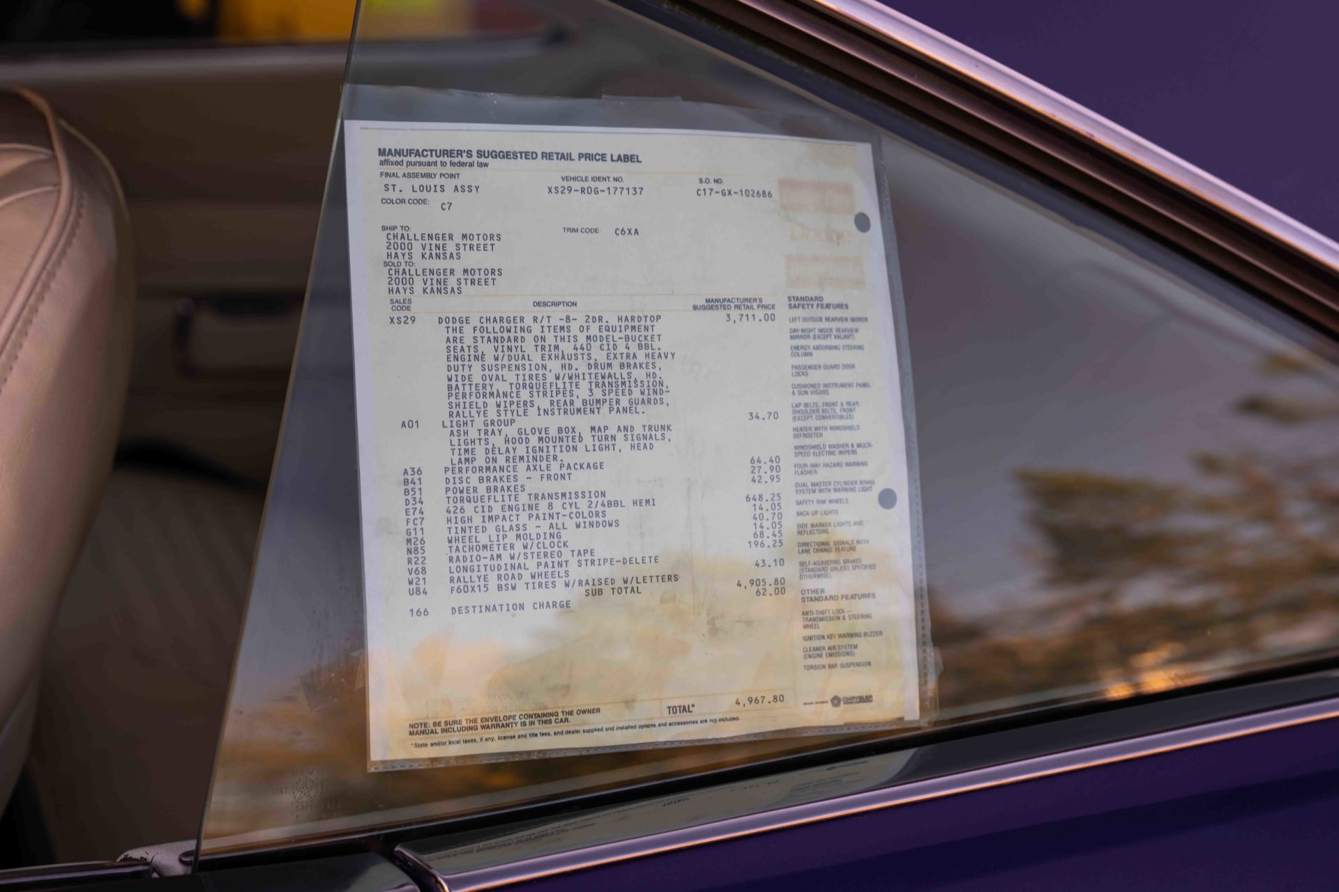 The Charger comes with the original broadcast sheet and window sticker, original trunk mat, original keys, and the original owner's manual. The winning bidder will also get service records and receipts, vintage photos of the car, and a documented ownership history from new.