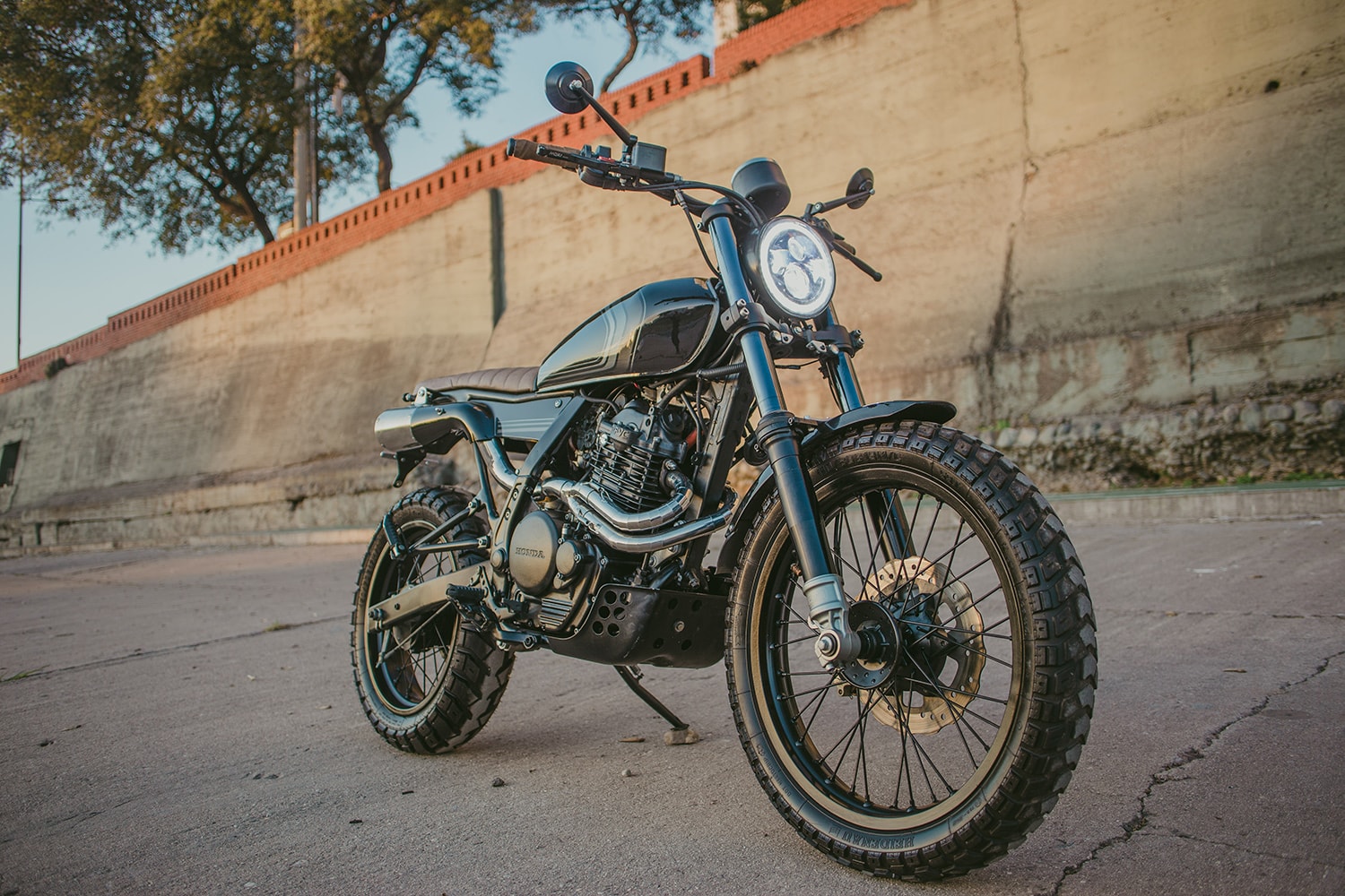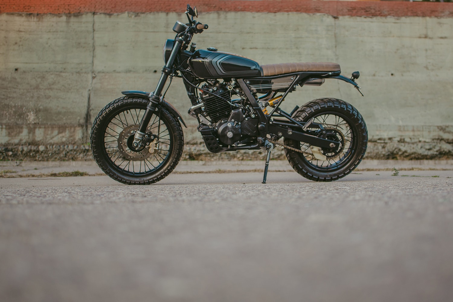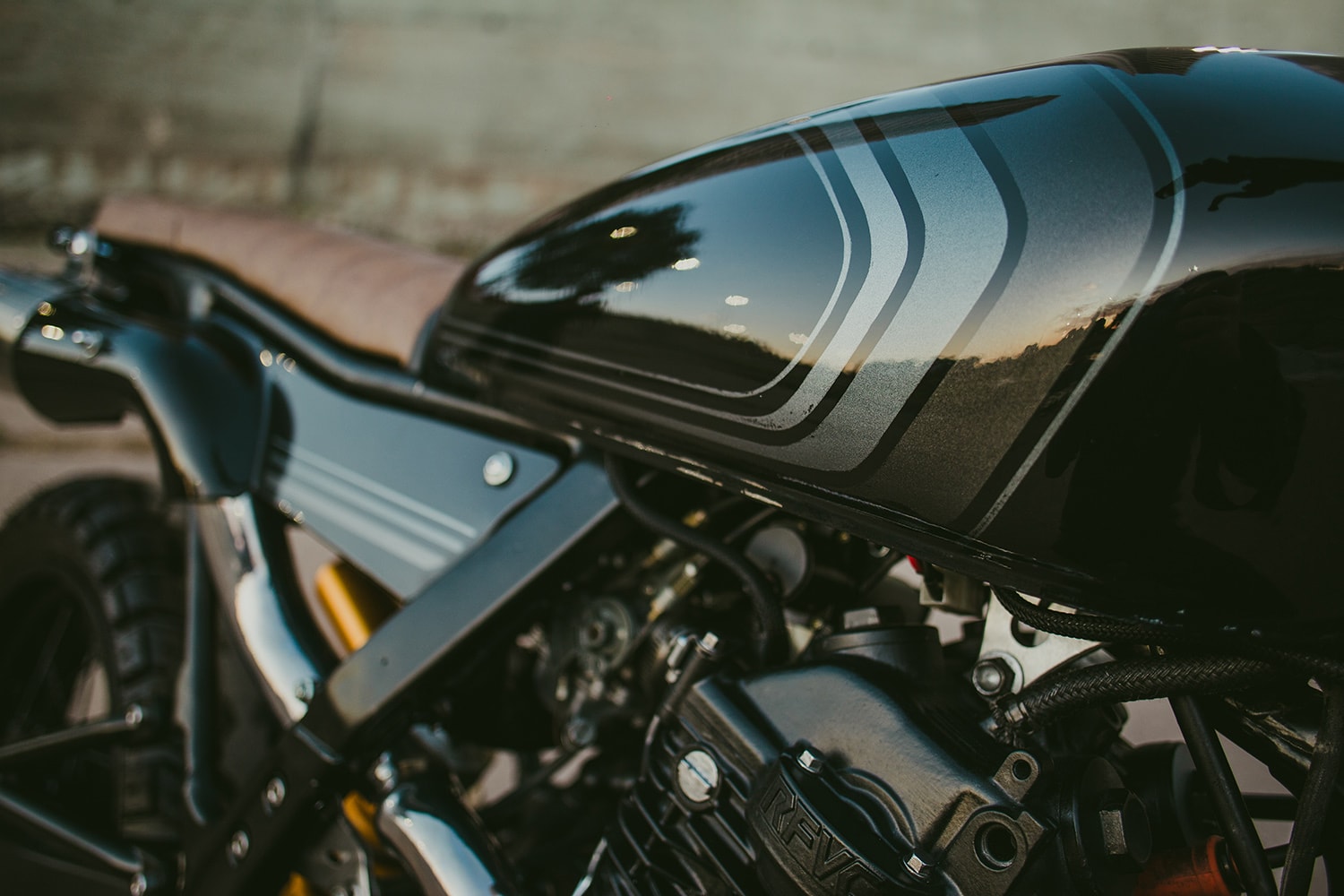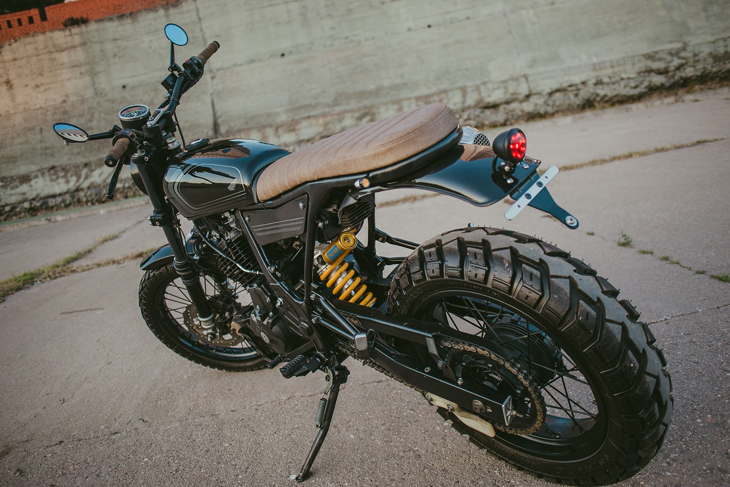 It supports a scrambler-style bench seat with high-density padding wrapped in tan leather, and there are small LED turn signals attached to the tubing left and right. Lower down, we see a bespoke rear fender whose southernmost tip is home to a circular taillight and the license plate bracket. Handmade side covers are located a bit further ahead, concealing the airbox and an under-seat electronics tray.
