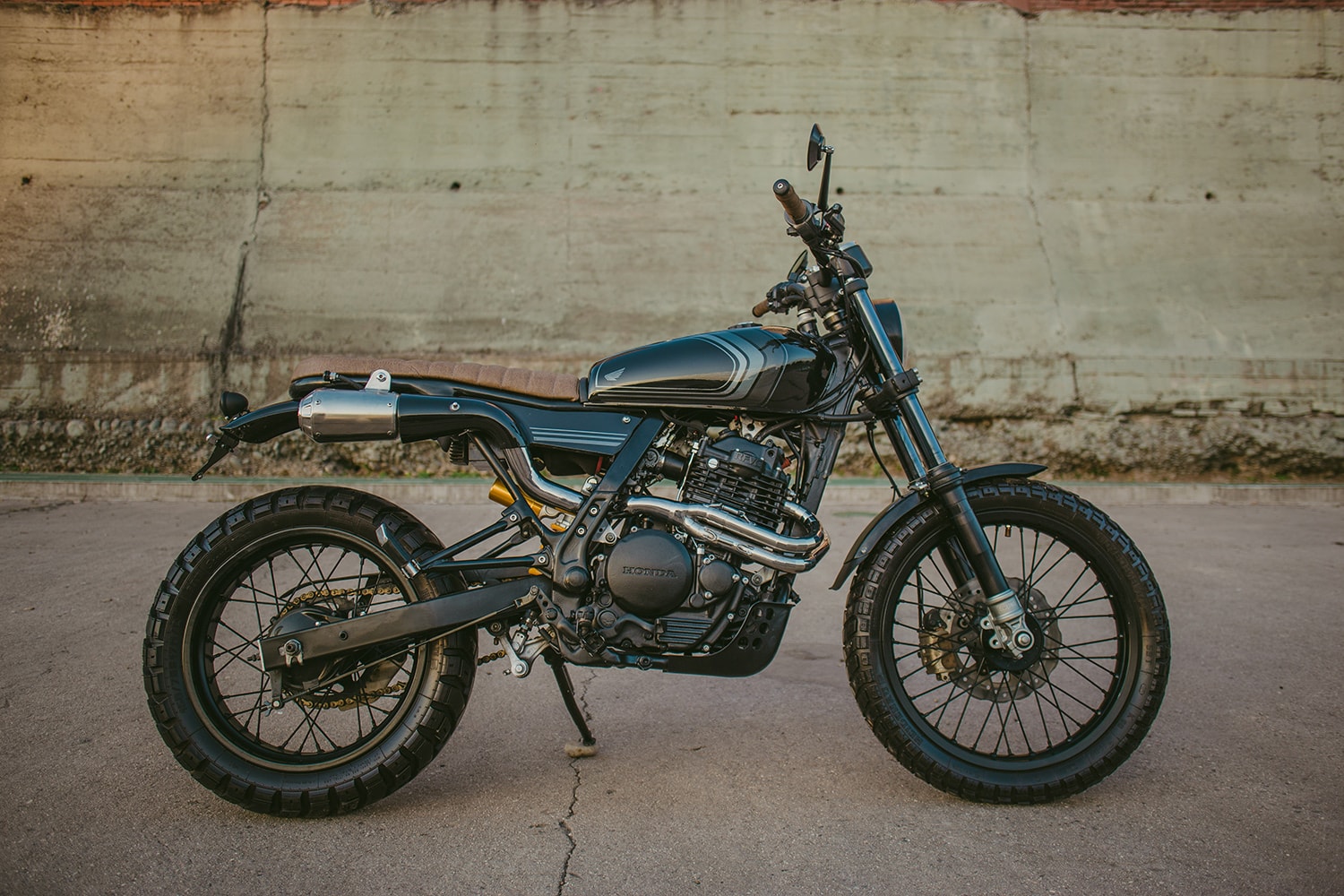The right unit also forms a heat shield for the exhaust, which is a custom stainless-steel part manufactured from scratch. Going back to the bodywork, the centerpiece is a CG125’s fuel tank adapted to suit the Dominator’s frame, with tailor-made mounts holding it in place. A protective sump guard keeps the engine’s underside out of harm’s way, and we find a second bespoke mudguard at the front.