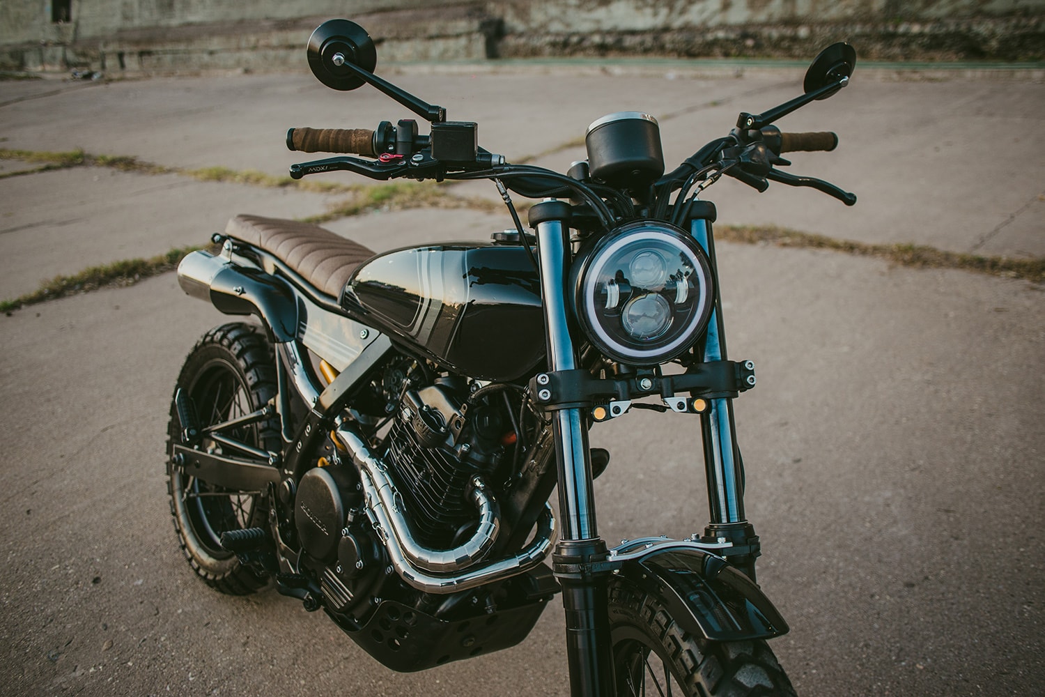 Unsprung territory houses a new set of wheels shod in dual-purpose Heidenau rubber, offering plentiful grip both on and off the tarmac. Front-end illumination is provided by a state-of-the-art LED headlight, while the turn signals are placed lower down on the bottom triple clamp. In the cockpit area, Lucas installed a multi-function dial and a replacement handlebar, with the latter sporting leather grips, round mirrors, and a top-notch brake master cylinder.
