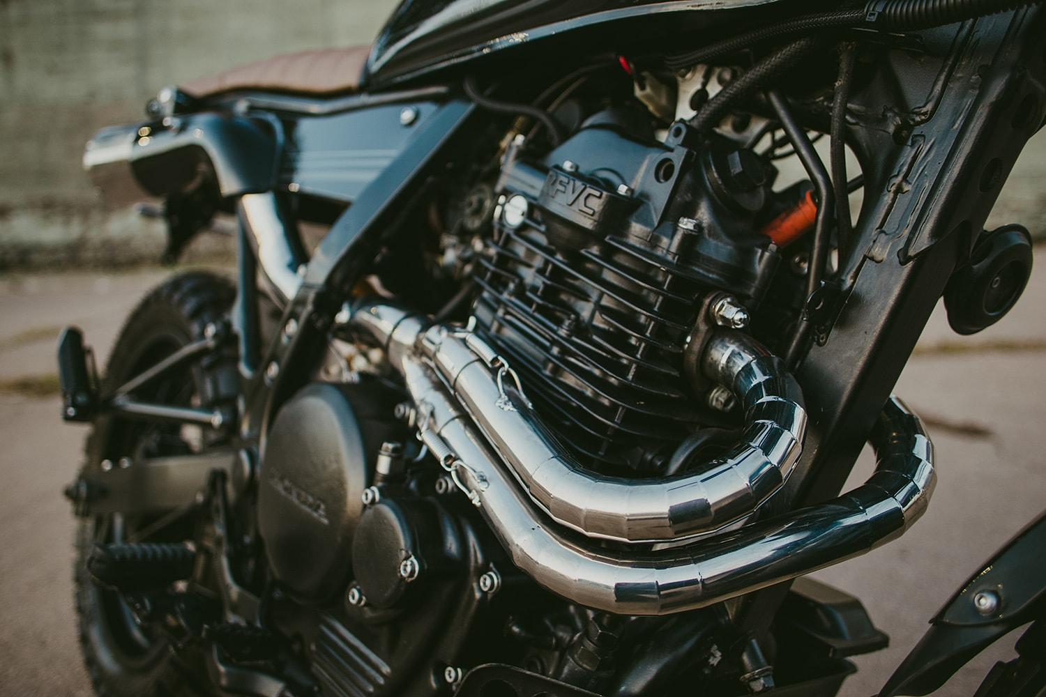 Shop boss Lucas Layum used a 1993 variant of Honda’s lineup as his starting point, and the client was happy to give him free rein over the customization process. First things first, Lucas had the NX650 stripped of all its factory bodywork, together with the wheels, suspension, and front brake. The stock subframe was deleted, as well, making room for a looped custom part fabricated in-house.