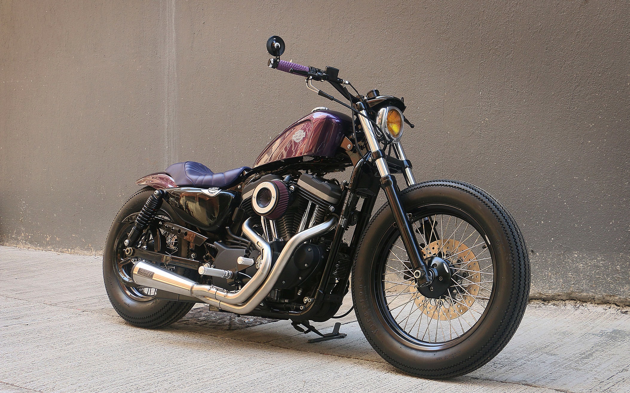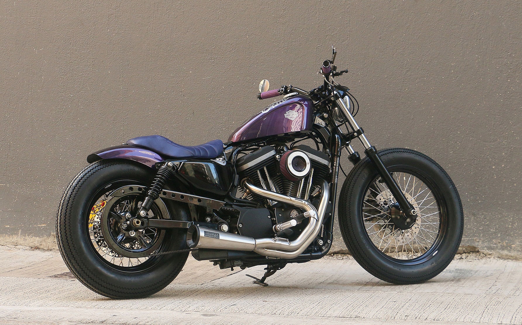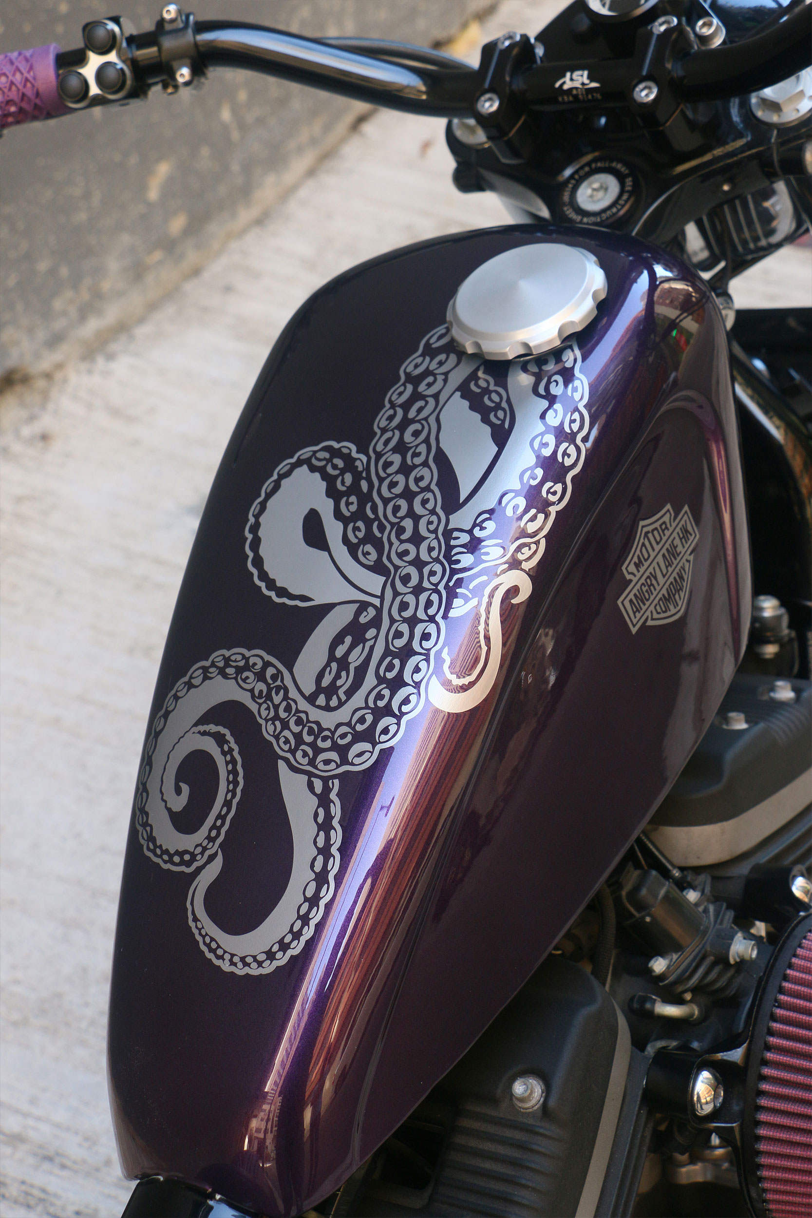 Now, the paintwork is what really brings everything together, with a shade of purple also chosen as the base color for the tank and fender. The customer's request was honored with some silver tank graphics depicting octopus tentacles, besides a pair of Harley-Davidson logos on the sides. Most other items were painted black in a mixture of gloss, matte, and satin finishes.
