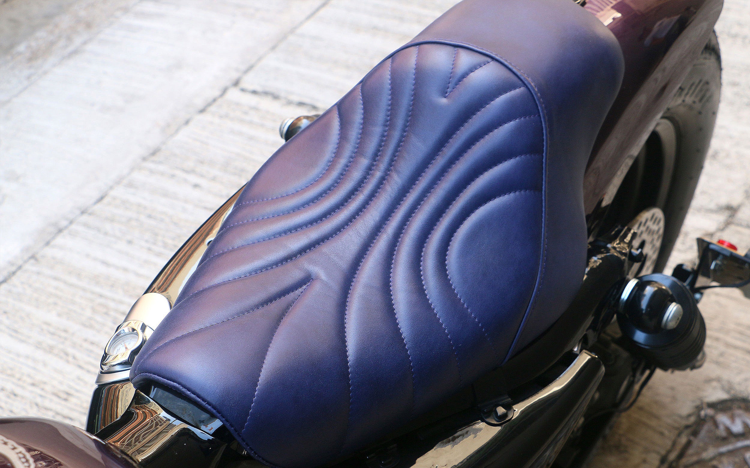 Browsing through the Rough Crafts catalog, they picked up a stunning fuel tank topped with a billet aluminum filler cap. A new rear fender was thrown into the shopping cart, too, and the groovy saddle placed between them was fabricated in-house by Ben and upholstered in purple-dyed leather. Up north in the cockpit area, there are color-matched Biltwell grips worn by an LSL handlebar.