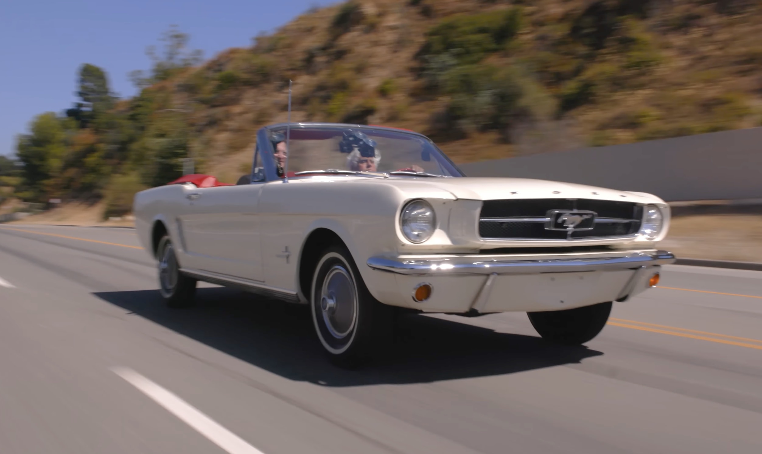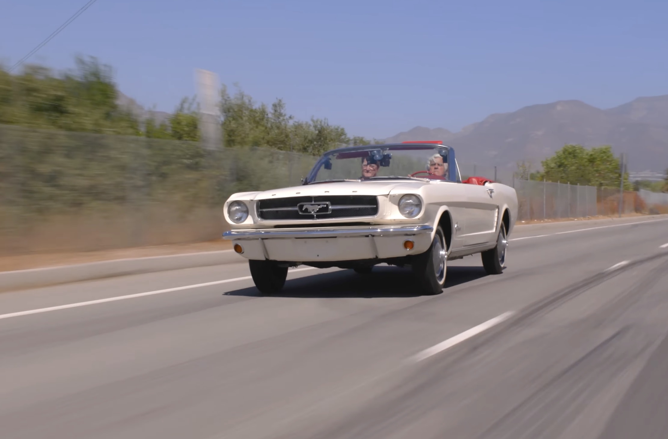 Jay Leno takes the Mustang out for a drive down memory lane: "Suddenly, it is 1964!" he says from behind the wheel. It doesn't have power steering, but he doesn't really miss it much. The car is light and agile, handles well, and is stable on the road.