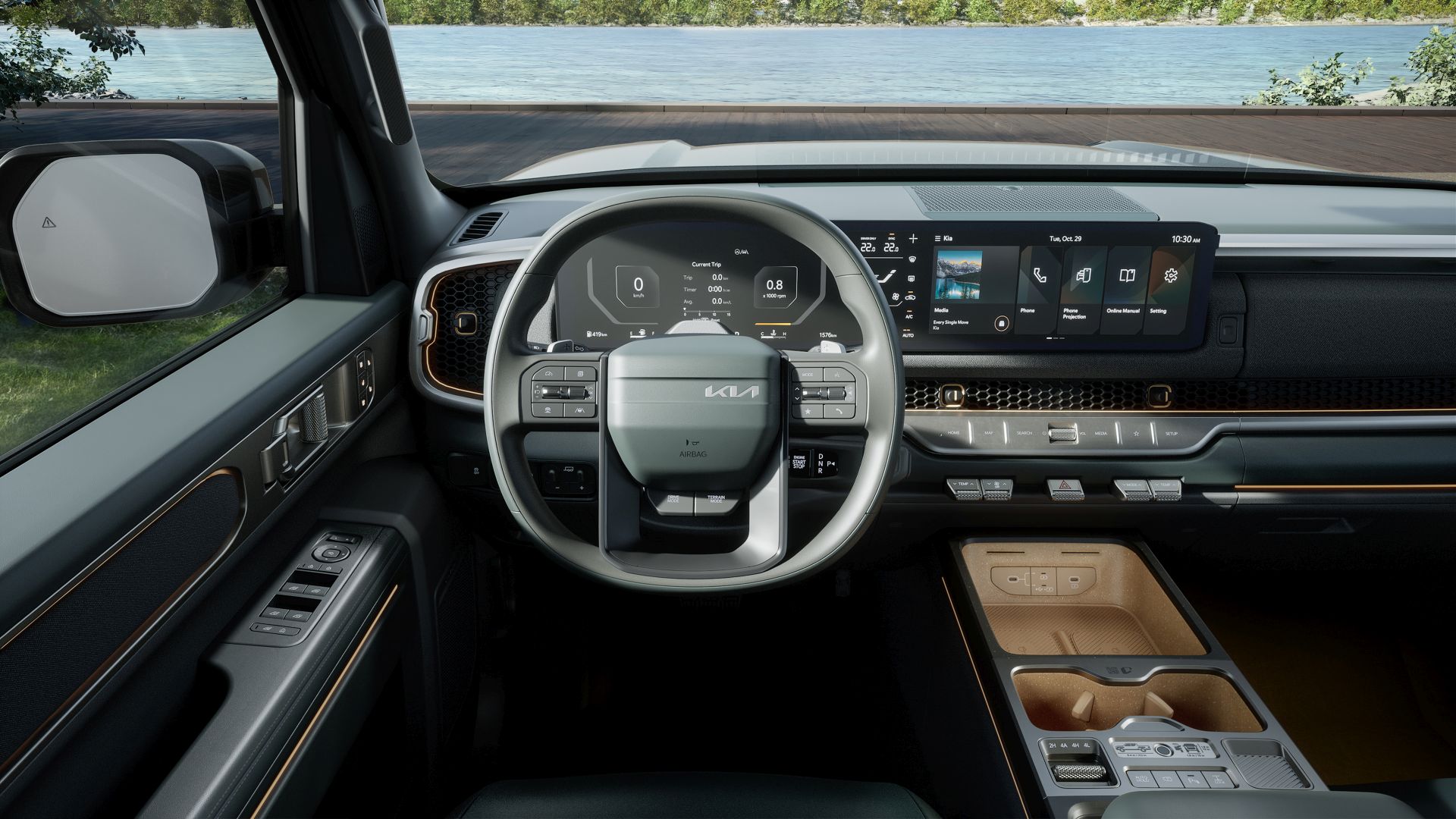 But the 2025 Kia Tasman targeted families looking for adventurous weekends in the wild. As a result, it fitted the pickup with modern amenities that could make the trip a pleasure. Atop the narrow dashboard, the automaker installed a dual-screen display, with a touchscreen placed atop the center stack and another for the instrument panel in front of the driver’s seat. Between the front bucket seats, the tall center console featured a fold-forward armrest cover that could transform the vehicle into a mobile office. In the back, the slide-forward and tilting seatback of the bench seat were appreciated by families.
