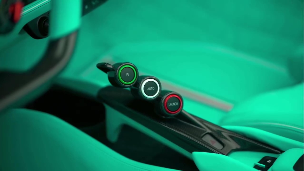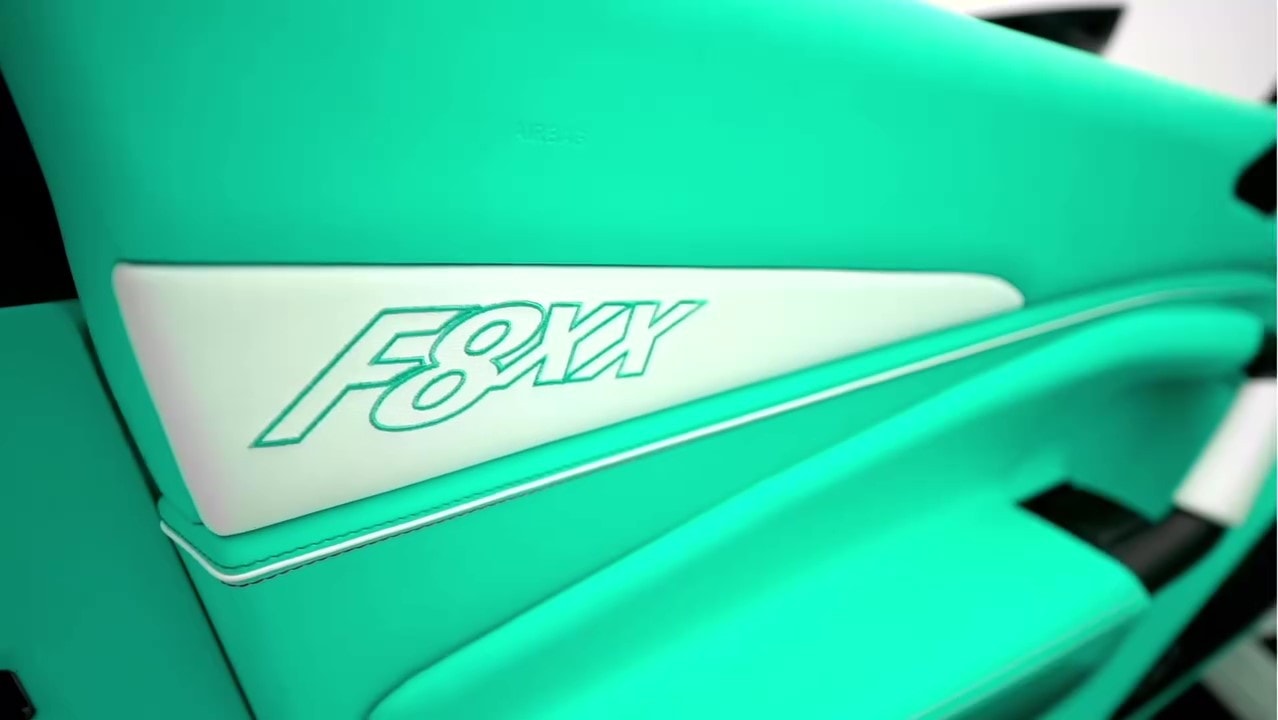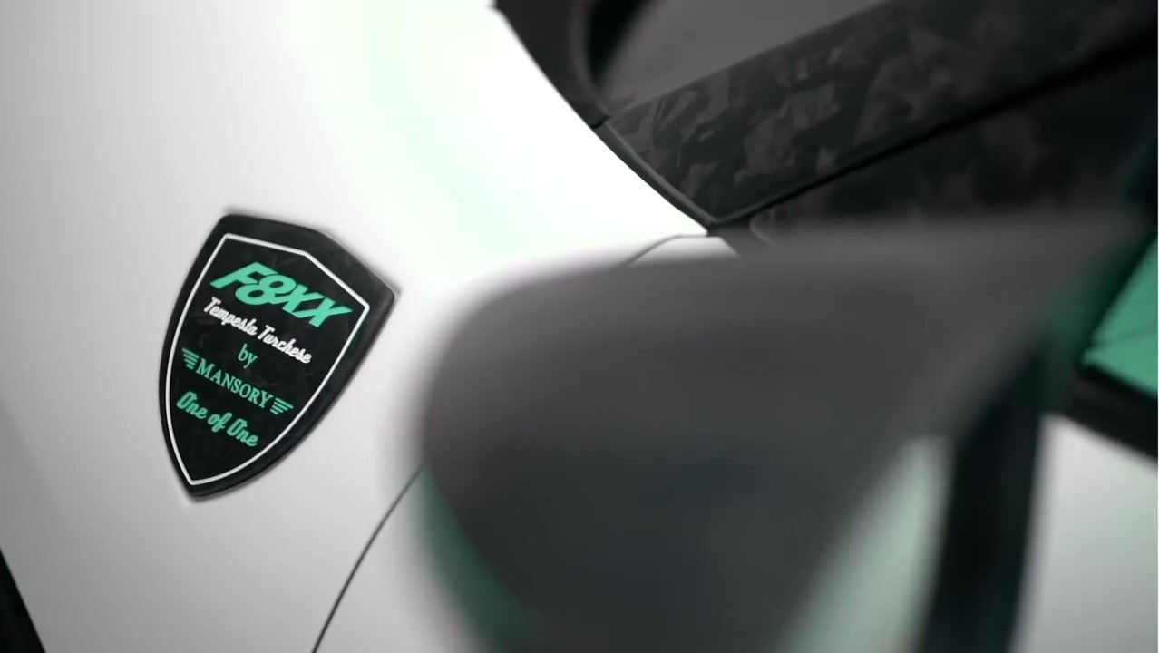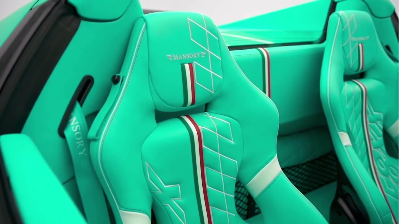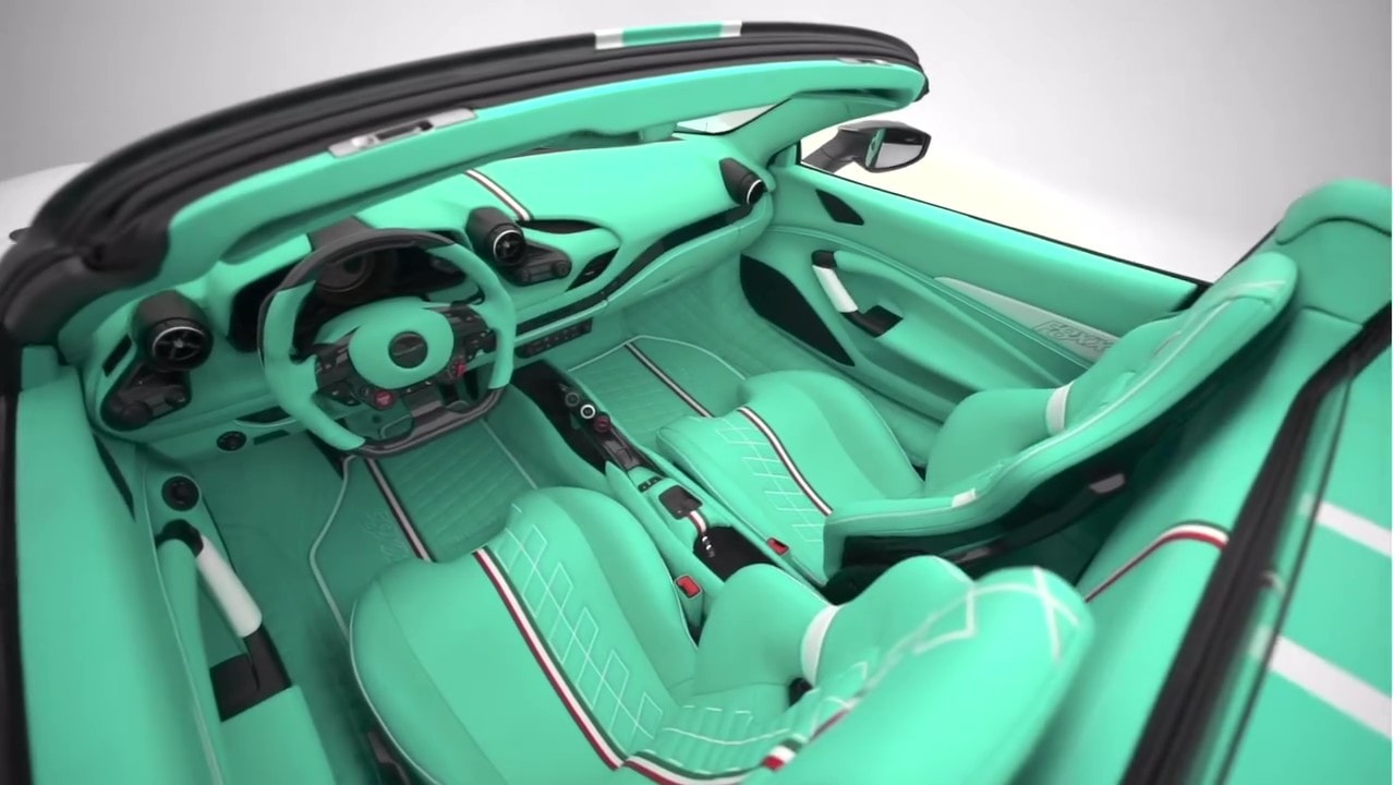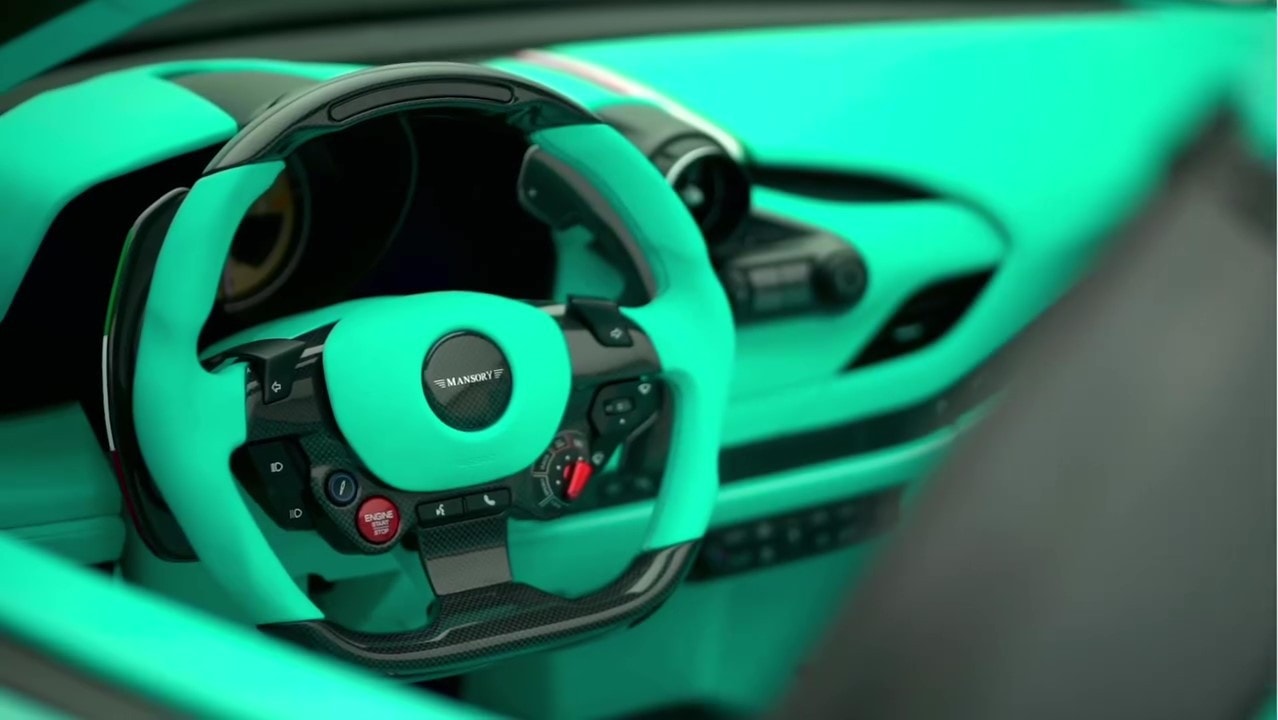 You may want to keep the turquoise-blocking eyewear for a bit longer, as it's now time to delve into the cockpit, which features new leather upholstery in the aforementioned color. The Italian flag motif is also on deck, the steering wheel was tweaked, and the door cards are new. Mansory's name and the F8XX logo are visible throughout the interior.