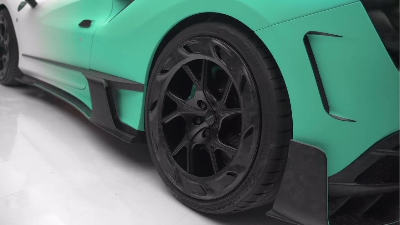 Do you have some turquoise-blocking eyewear around? Put it on, as it's time to speak about the so-called Mansory F8XX Spider Tempesta Turchese. The Italian supercar has a bi-tone look with a gradient that runs from turquoise at the rear to white at the front. As if that wasn't enough, racing stripes in the same hues run across the vehicle's length.