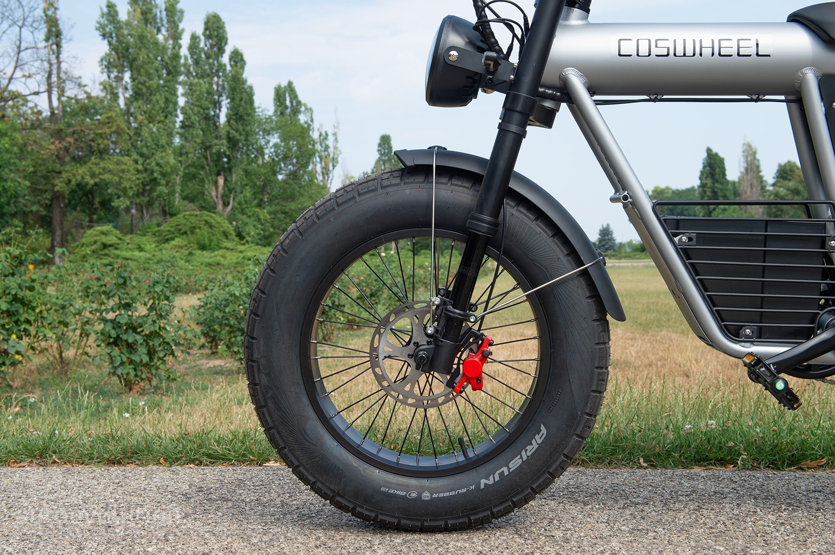 The tire setup is good. The bike sports Arisun moped-style 20" x 5.0" fat tires, which Coswheel describes as off-road tires. They can handle some light off-roading, but I wouldn't necessarily call them "off-road tires."