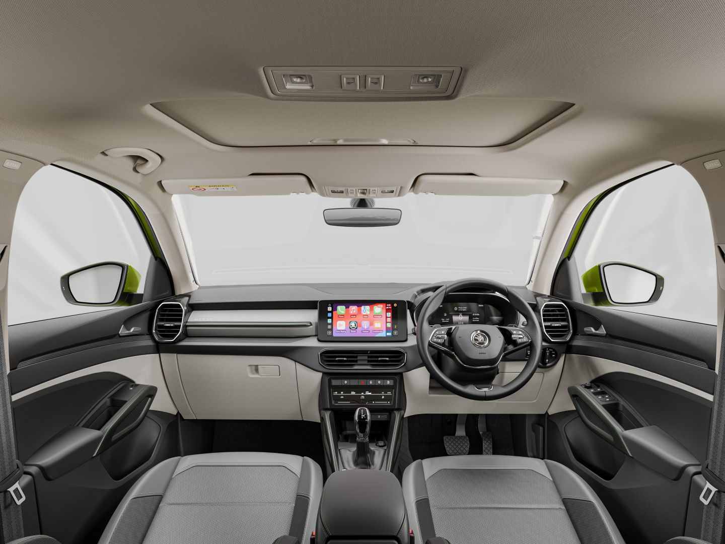 Inside, customers were greeted by a modern cabin. On the dashboard, atop the center stack, the 2025 Skoda Kylaq had a 10.1" touchscreen. At the same time, the driver fronted an eight-inch display for the digital cockpit, which showed all the vehicle's essential data. On the center stack, the car manufacturer installed the HVAC control panel. The center console housed the gear stick or the gear selector (depending on the options), the handbrake, and an armrest with a cubby underneath. The tall-mounted seats with available ventilation and six-way power adjustments hugged customers. Furthermore, selected versions were available with a power sunroof. These were unusual features for a subcompact crossover. In the back, the bench seat could accommodate up to three passengers, and the trunk could expand from 446 liters (15.7 cu-ft) to 1,265 liters (44.6 cu-ft).