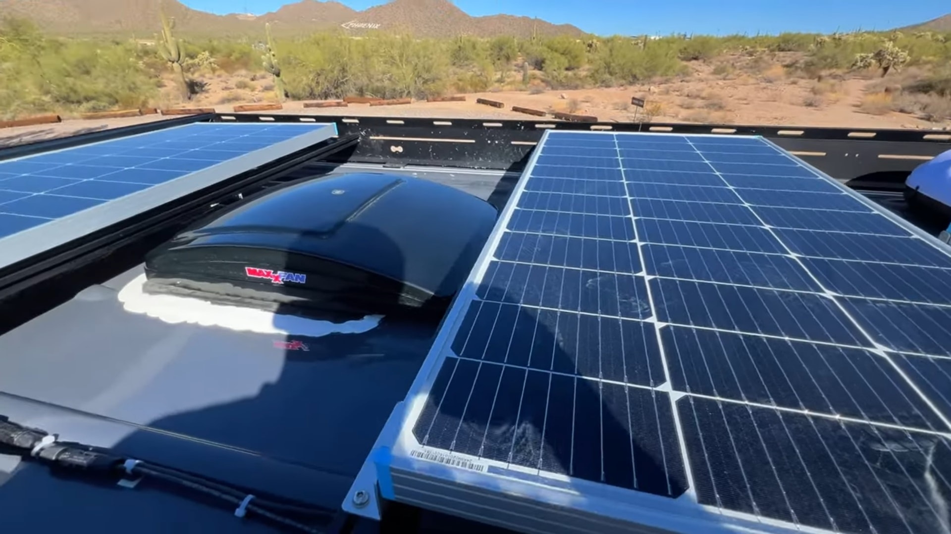 The van's exterior is equipped with running boards, a roof rack that holds the solar panels, and a side ladder, and the huge garage space at the rear allows adventurers to take with them all the outdoor gear and equipment they need.