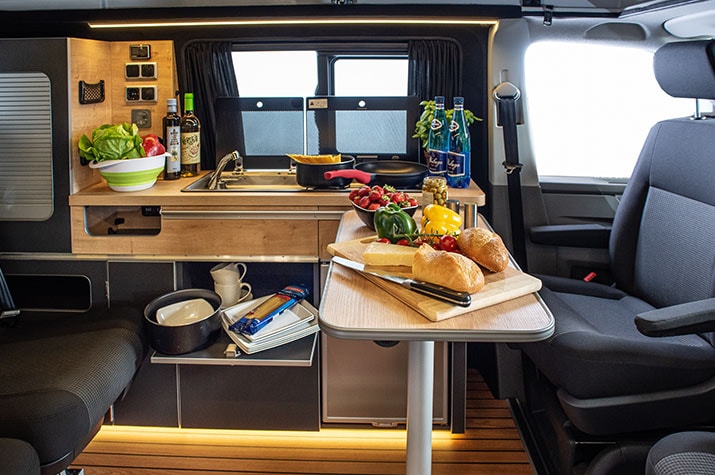 Both kitchen and restroom facilities are basic, but they will do for a weekend getaway with the family. Presumably, the goal of such an outing is to get out more into nature and not spend time inside the RV. To that end, the VW Short offers two dining tables, a smaller one that can be used indoors and a larger one you can set up outside, which tucks into the sliding door when you don't need it.