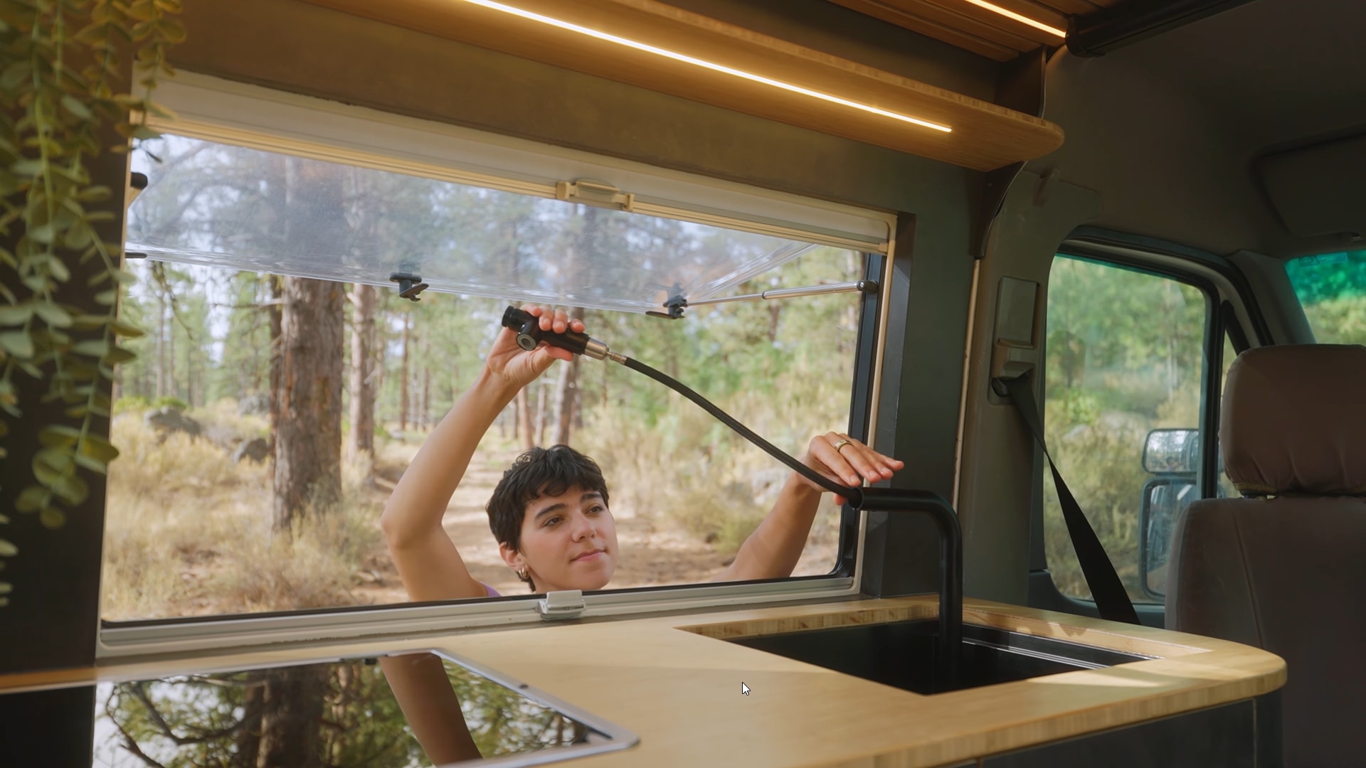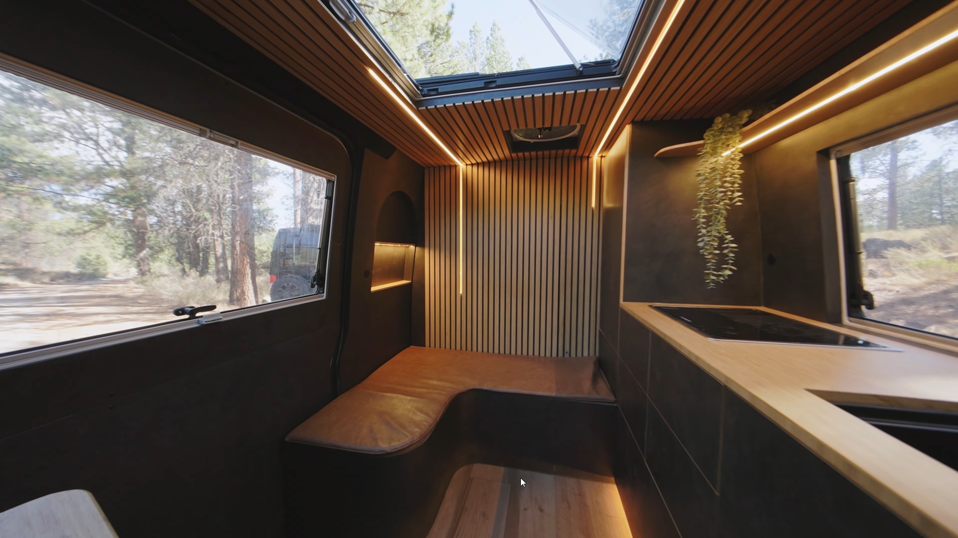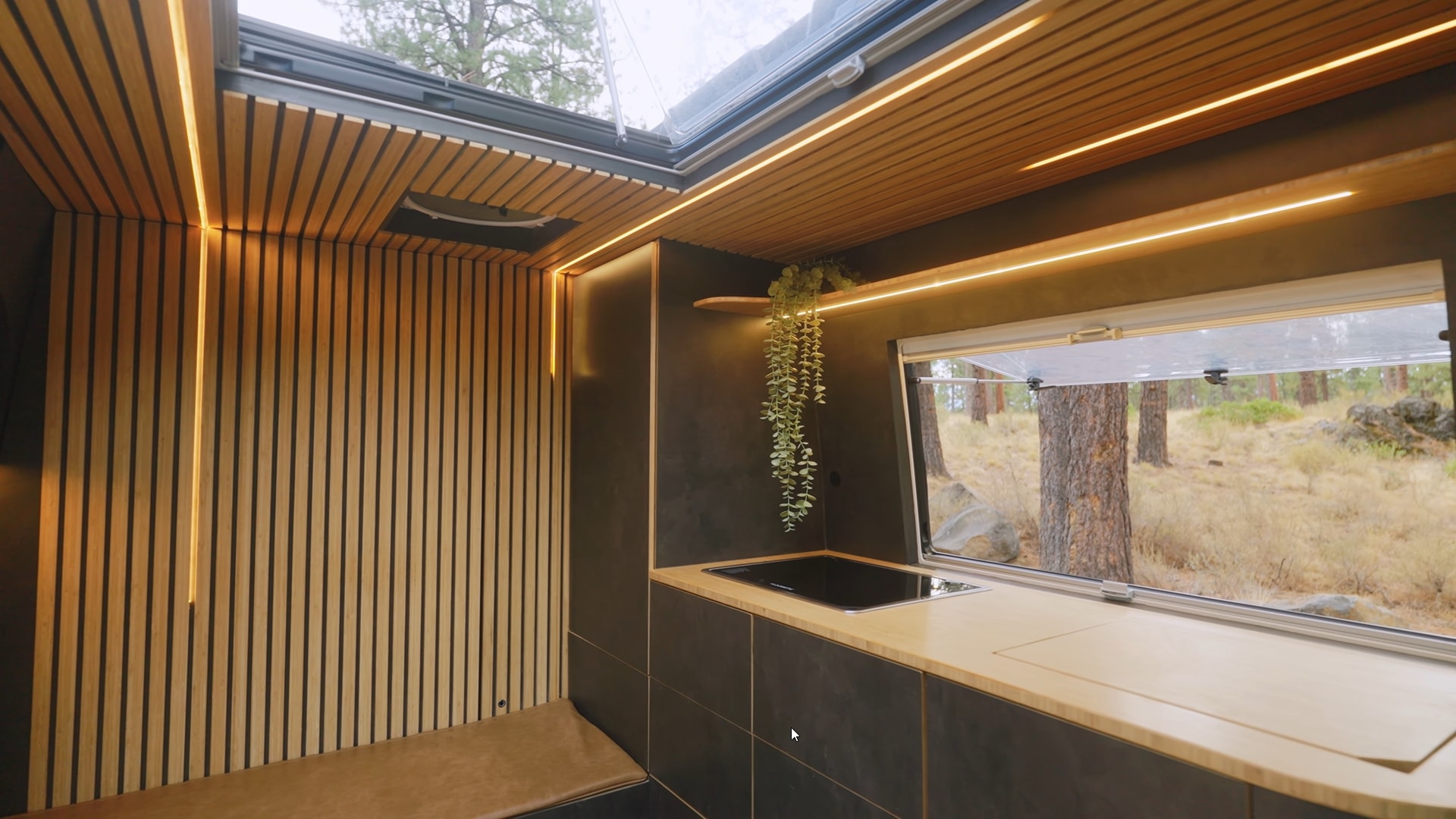 Scarlet and Seth opted for a slatted design for the ceiling and the rear wall, beautifully complemented by long LED light strips. And yes, you read that right. This interior has a rear wall – I'll explain this setup soon. The modern aesthetic continues with black cabinetry paired with wood accents, like the countertop, and brown leather upholstery.