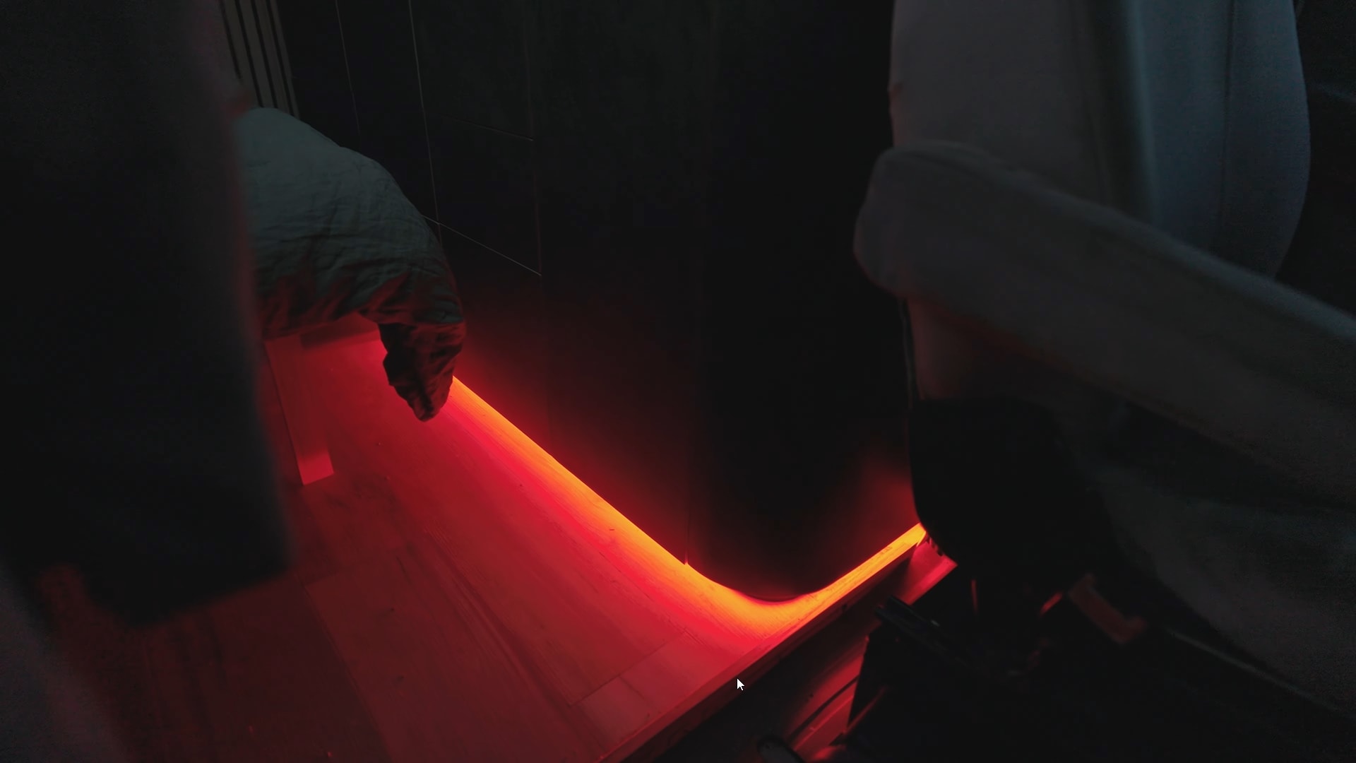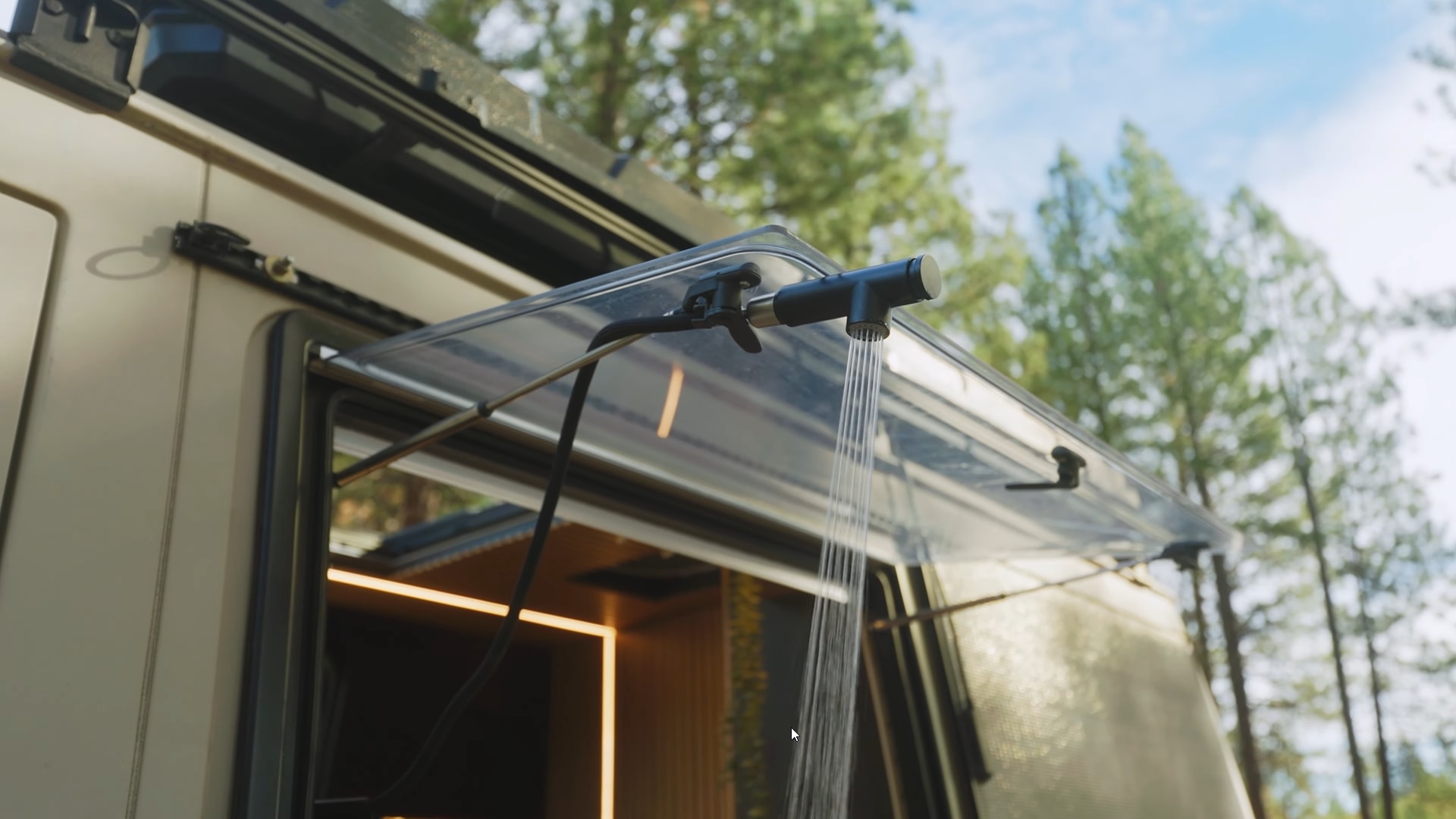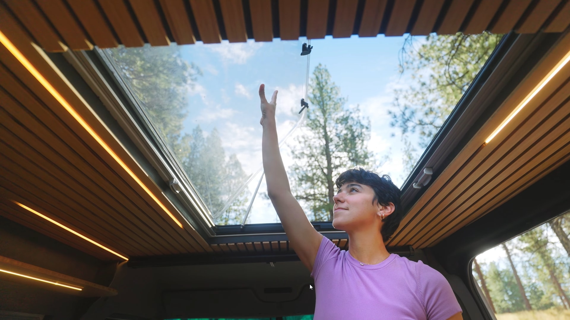 Scarlet and Seth opted for a slatted design for the ceiling and the rear wall, beautifully complemented by long LED light strips. And yes, you read that right. This interior has a rear wall – I'll explain this setup soon. The modern aesthetic continues with black cabinetry paired with wood accents, like the countertop, and brown leather upholstery.