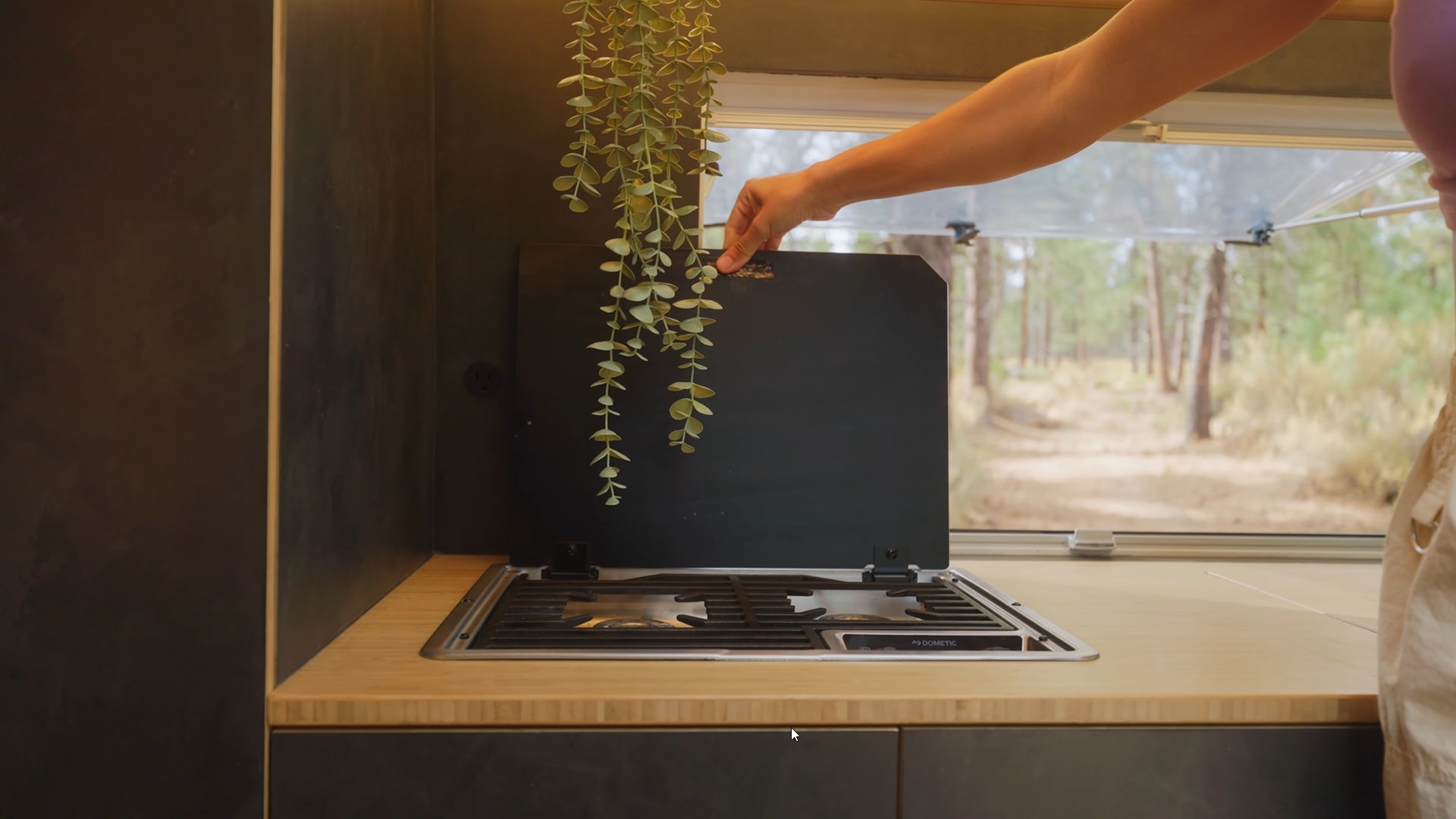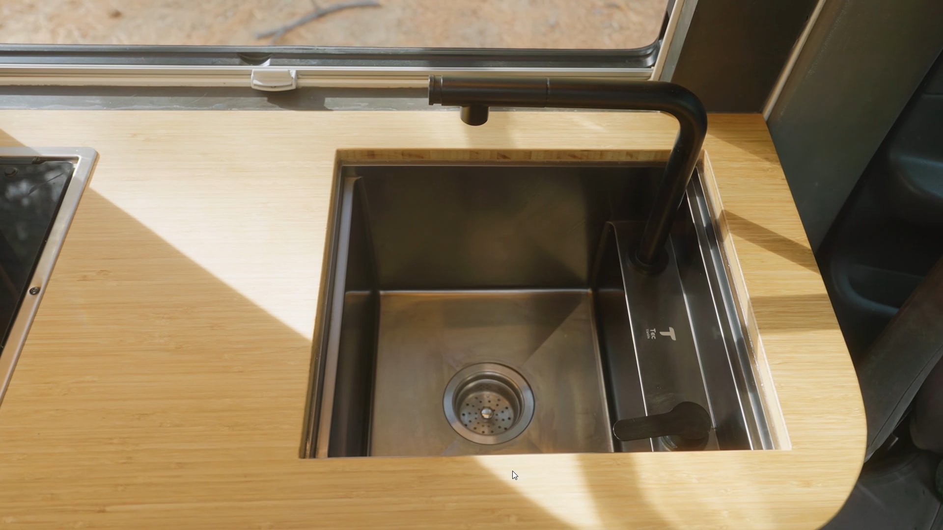 You'll find the rig's kitchen dead ahead of the entrance. It features a sizeable bamboo countertop, a deep sink with a pull-down faucet and a cover, a built-in Dometic two-burner stove, and a 72-liter Isotherm fridge/freezer.