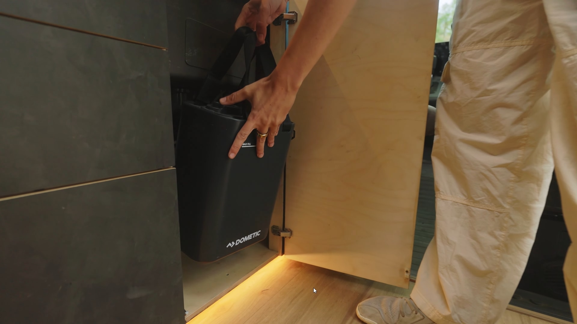 For storage, you can use four drawers and a cabinet underneath the sink. The latter houses the sink's simple plumbing system made out of two 5-gallon (19-liter) jugs: one for freshwater and the other for greywater.