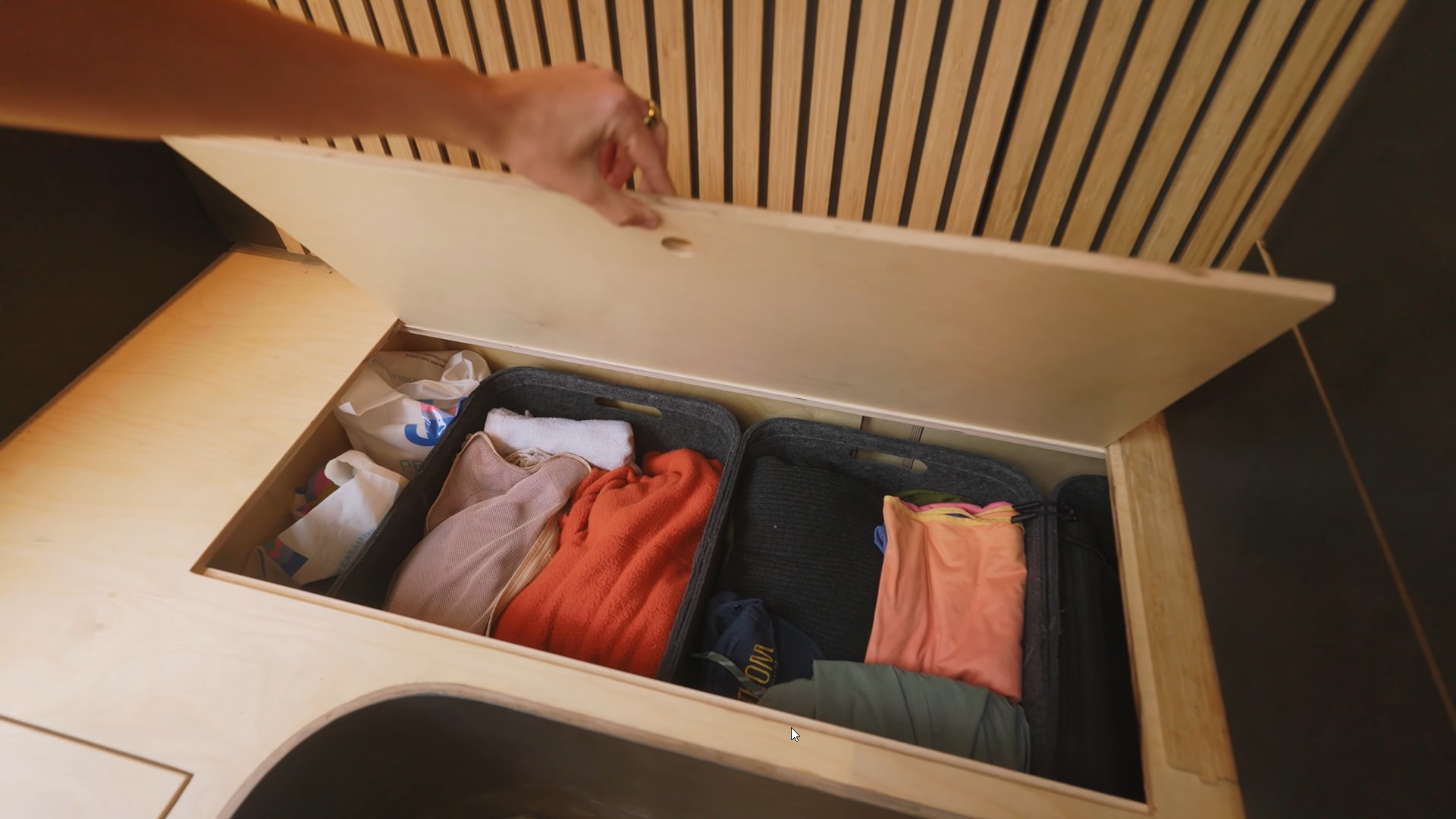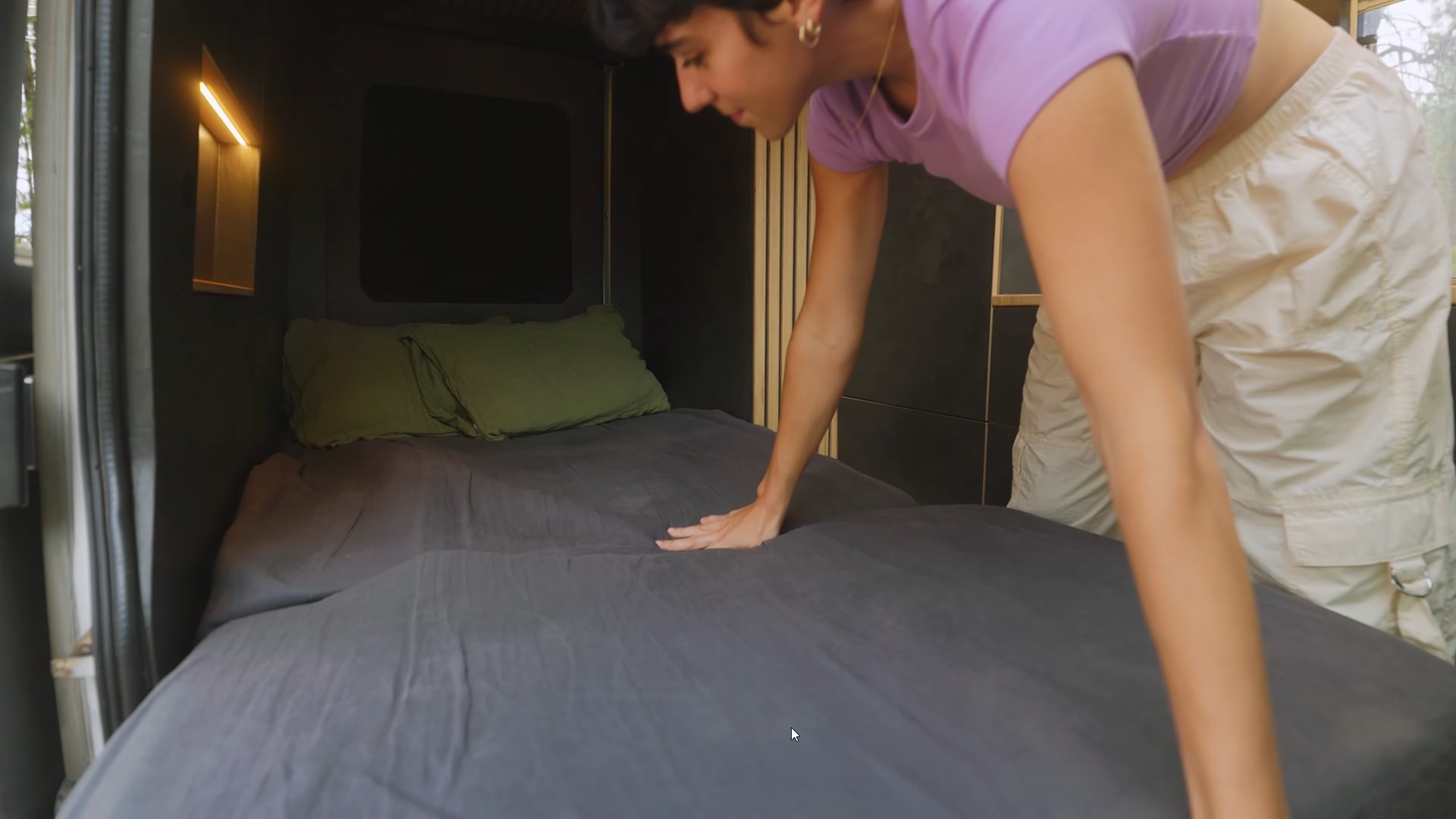 In a van this small, installing a fixed bed would've taken about half of the valuable living space. So, Scarlet and Seth came up with a clever solution: they created a rear slatted wall (which I also mentioned earlier) that hides a bed behind.
