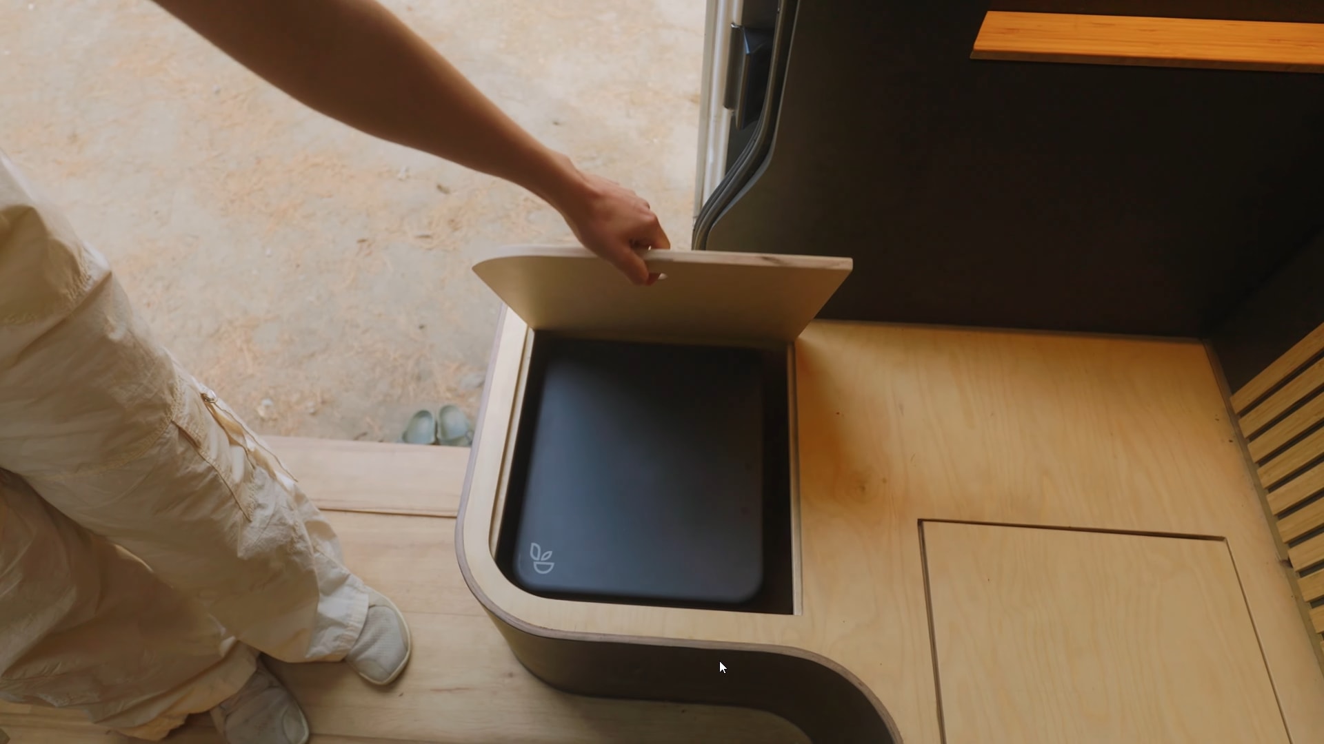 On the opposite side, the duo devised a seating area consisting of an L-shaped bench. Lift its leather-upholstered cushion, and you'll reveal two compartments. The one closer to the entrance houses a Trelino composting toilet, and the larger one toward the rear offers storage space.