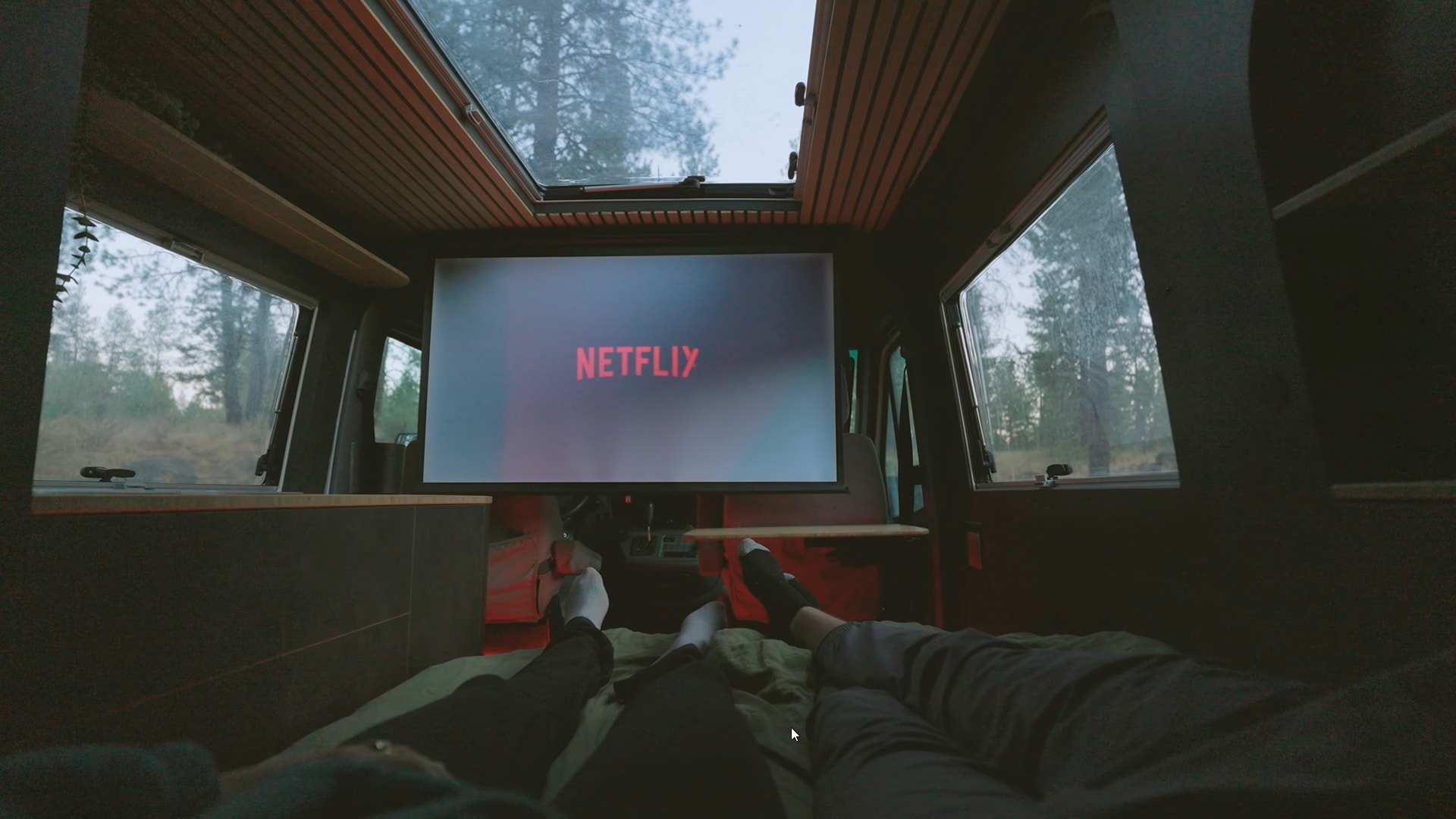 Scarlet and Seth can cozy up inside their camper van by creating a home cinema setup. They have a pull-down projector screen at the front, and they use a projector to display movies or series. What's more, the screen is perfectly positioned to be watched from the comfort of the bed.