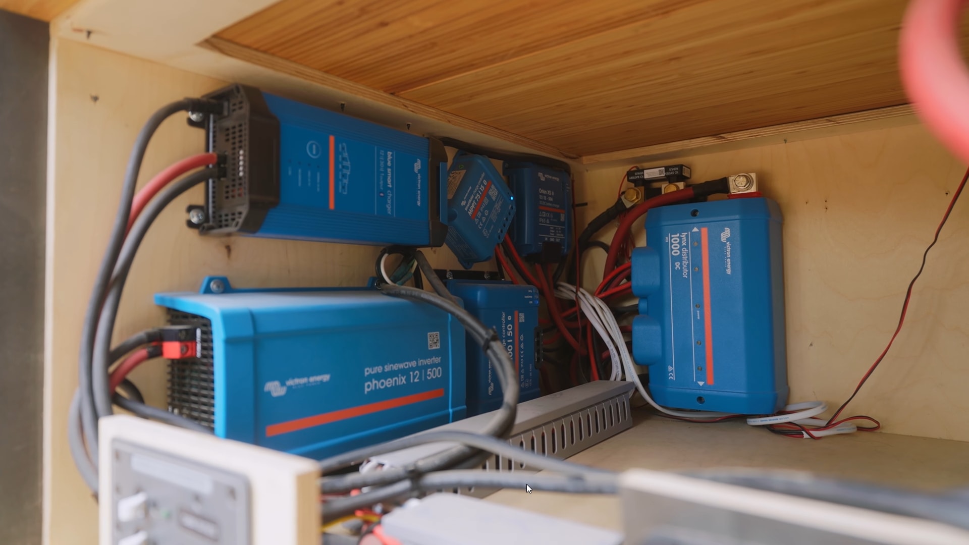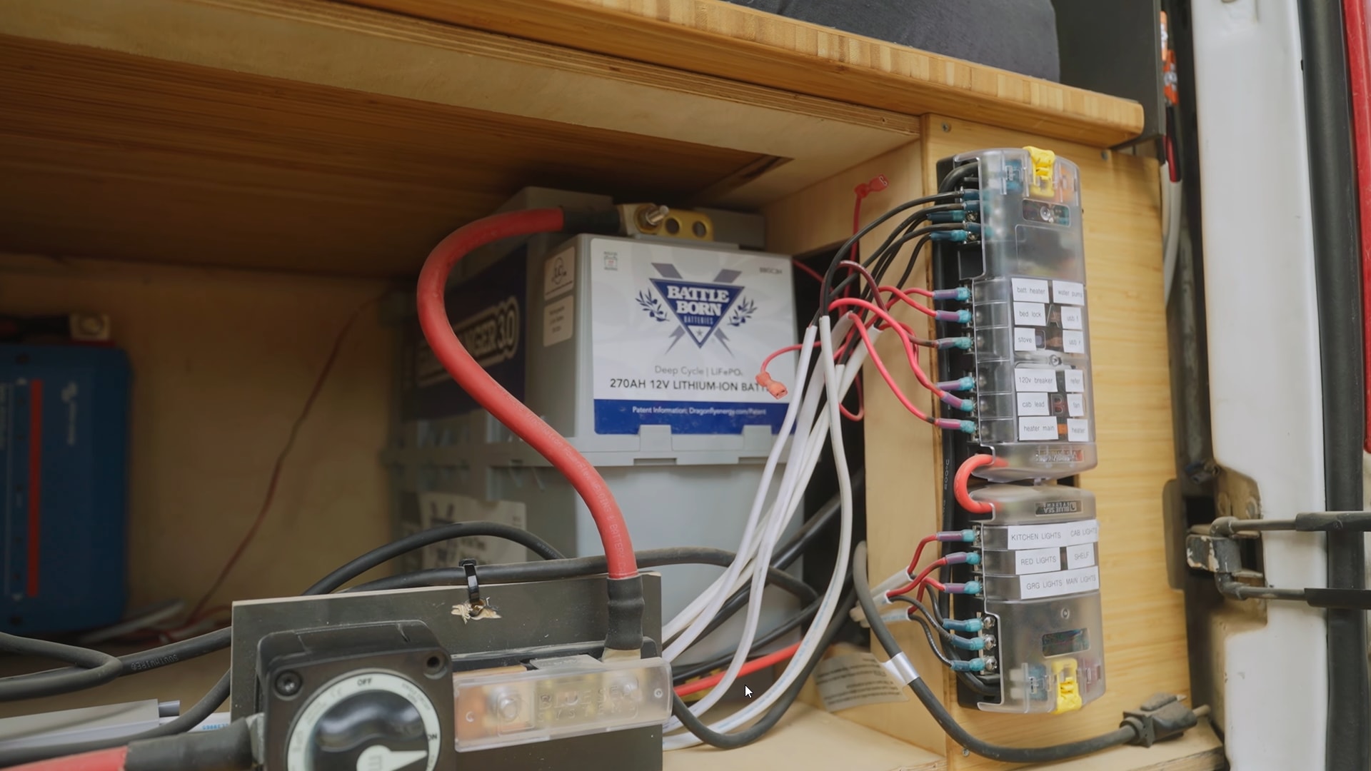 The couple installed the electrical system underneath the bed. Its highlights are a 270 Ah BattleBorn battery bank with a warming feature, a 50-amp battery-to-battery charger, two charge controllers, and a 30-amp shore power charger. All these components make the power system able to sustain off-grid travel.