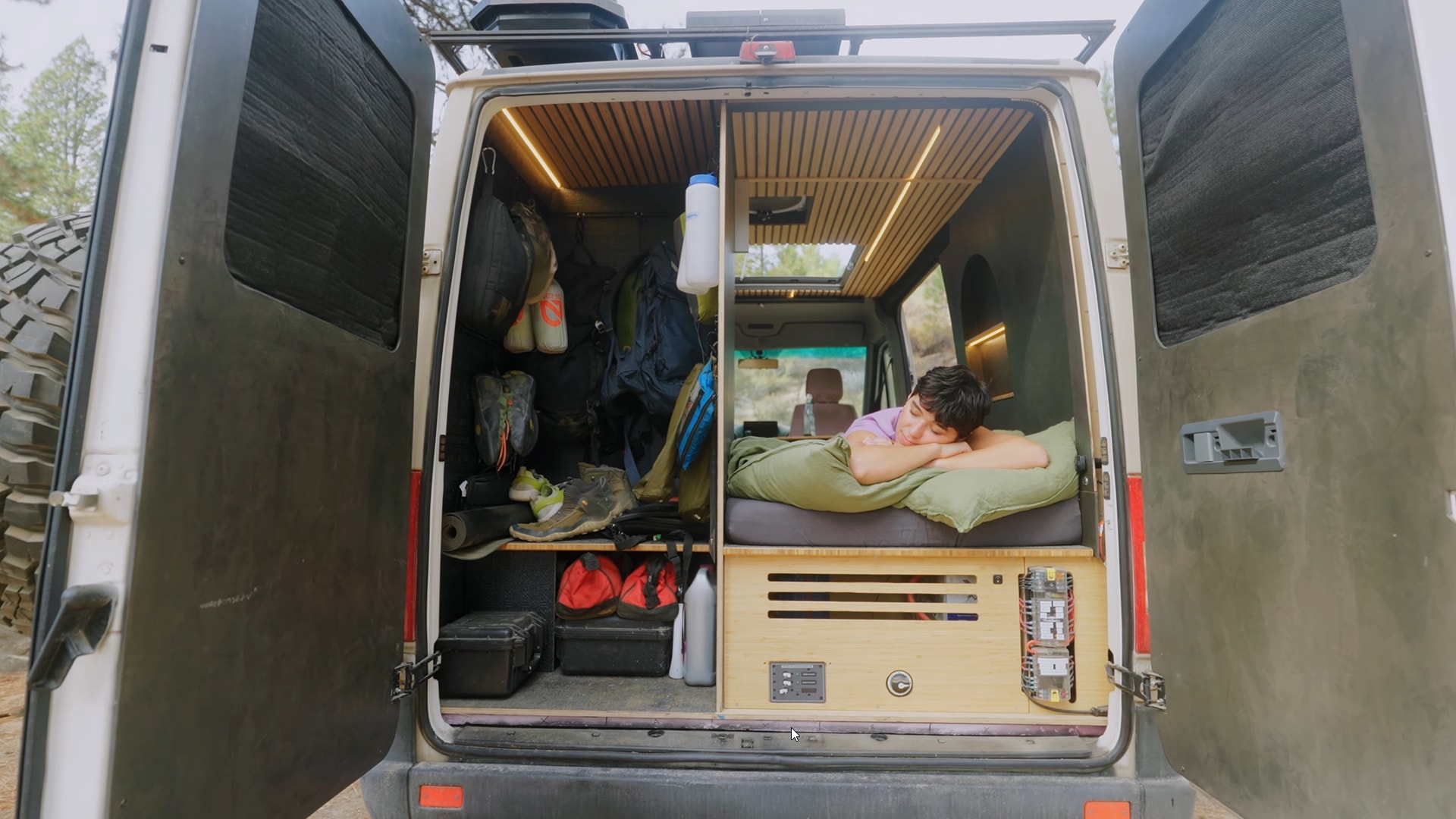 Scarlet and Seth installed a custom rack made from 8020 aluminum extrusions on the roof. It holds a long cargo box and 295 W of walkable solar panels. The roof also has a vent fan and a large skylight that can be opened. Finally, you'll discover a spare tire carrier and a ladder at the rear.