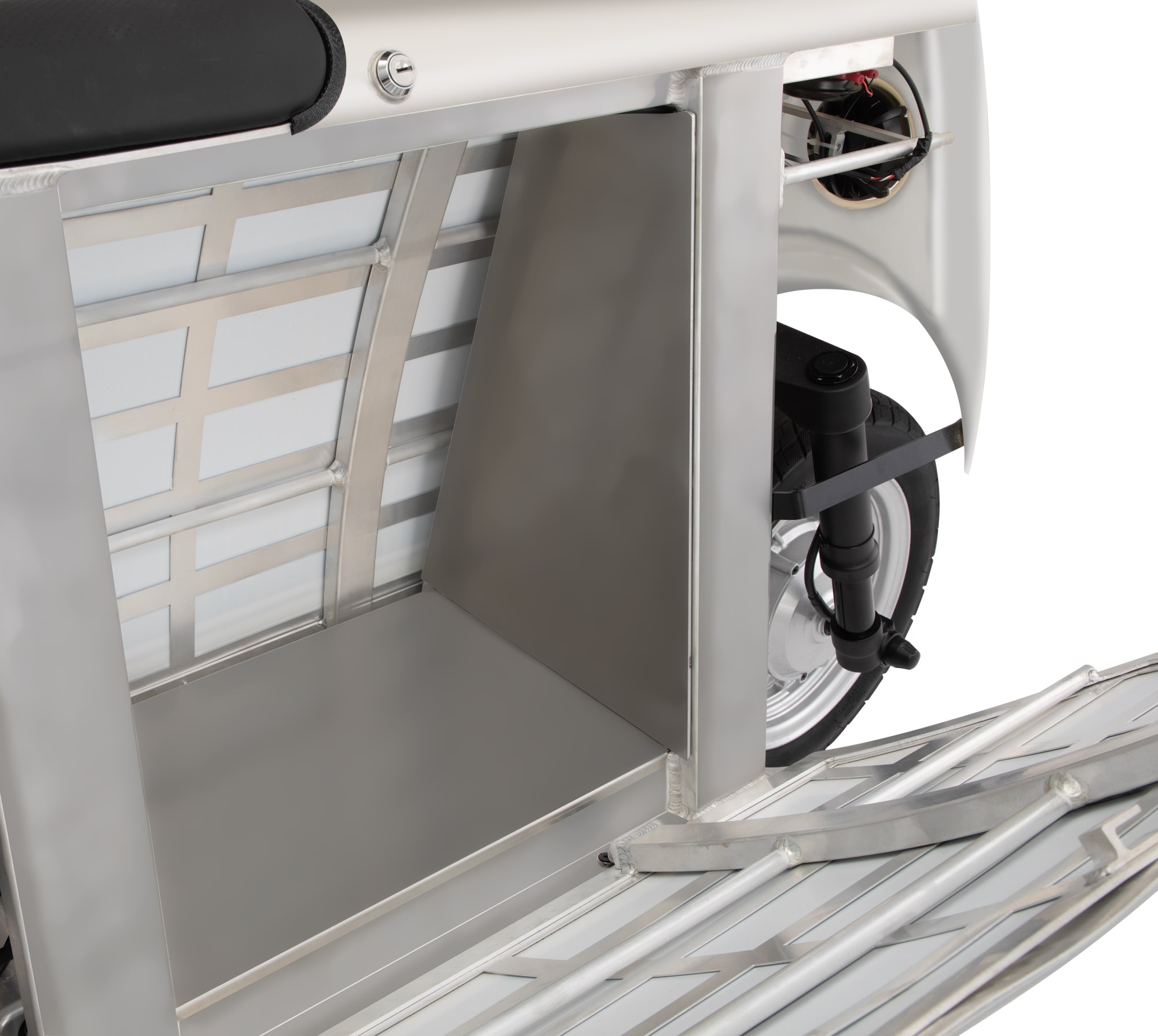 Secondly, it can be used on solar power only for shorter commutes. It's also safe, comfortable, and very convenient thanks to the suitcase-shaped design that allows you to use it as one. That's one way of putting it: cargo space becomes accessible once you lift one of the solar panels, and it's large enough to fit three shopping bags.
